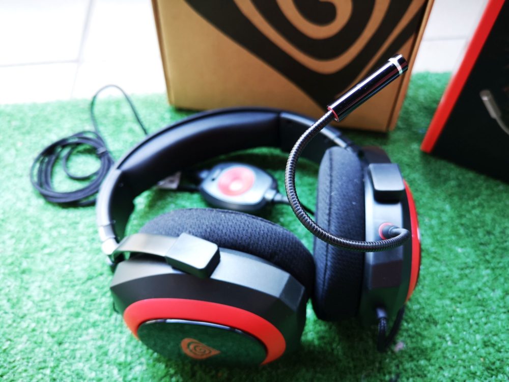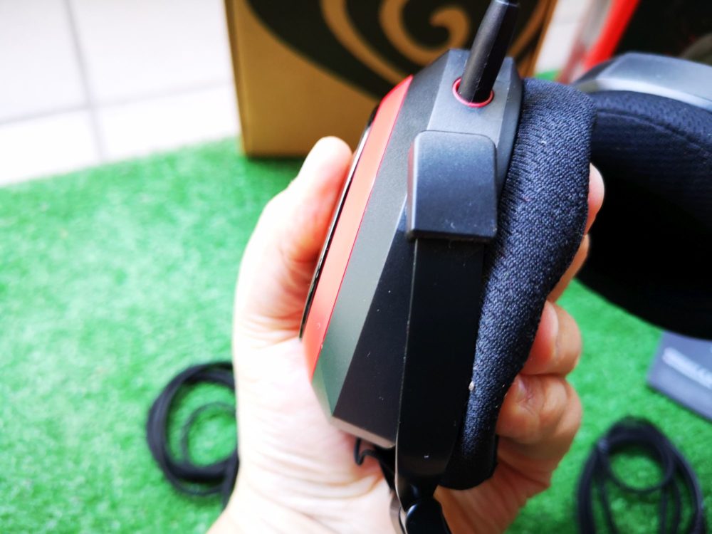 Na lewym nauszniku znajdziemy wejście na mikrofon. Mikrofon możemy odpiąć w dowolnym momencie. Dużą zaletą mikrofonu jest jego elastyczna konstrukcja, która pozwala na jego ustawienie w najbardziej wygodny dla nas sposób.