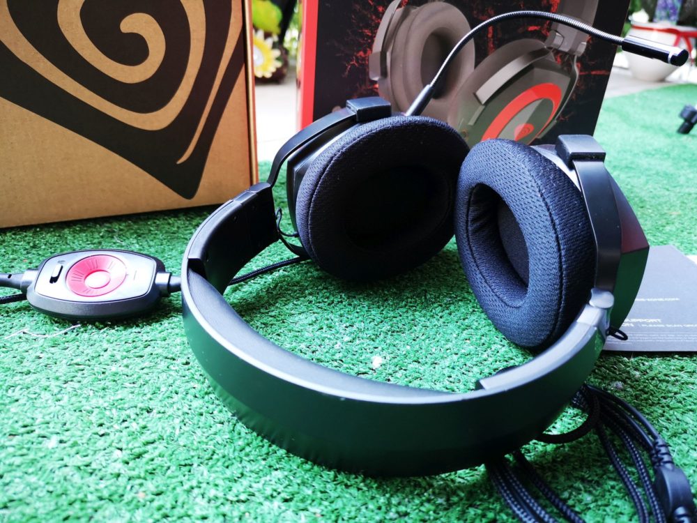 Środek słuchawek został wykonany z bardzo miękkiej gąbki, które również zostały obłożone materiałową siateczką. To duży plus, gdyż uszy nie będą się pocić jak często bywa przy skórkowych materiałach. Wnętrze muszli wyłożono delikatnym, czarnym materiałem. Same muszle są średniej wielkości, ale powinny bez problemu schować praktycznie każde uszy.