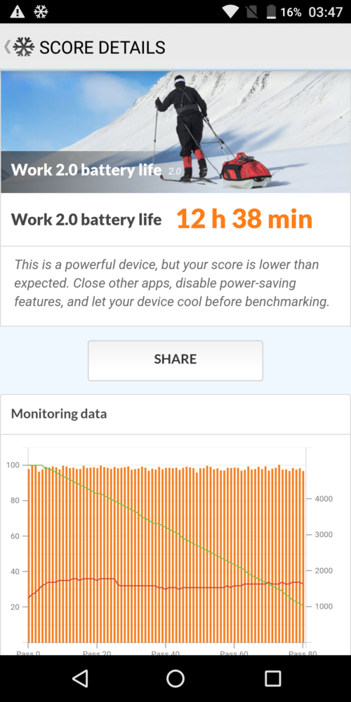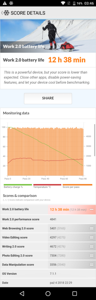 Dodam, że smartfon wyposażony jest też w inteligentny system zarządzania energią, który pozwala na wydłużenie pracy urządzenia dzięki aktywowaniu Trybu Normalnego lub Trybu Ekstremalnego. Przeprowadzony test realnej pracy, przeprowadzony programem PC Mark pokazał 12 godzin i 38 minut. Reasumując, bateria jest też bardzo mocnym argumentem do zakupu tego smartfona.