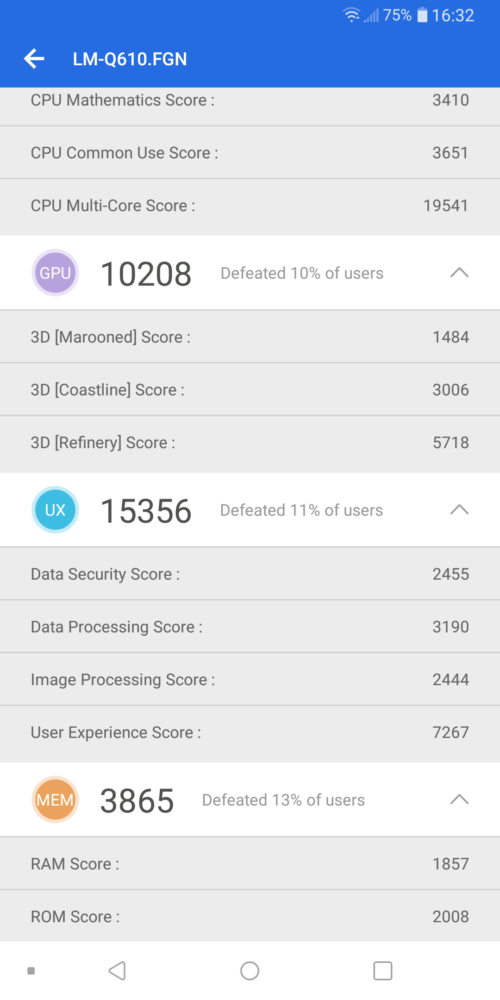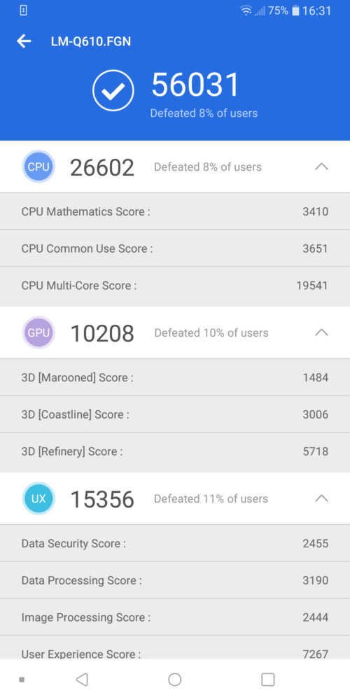 Pod maską LG Q7 znajdziemy ośmiordzeniowy układ MediaTeka MT6755, (4x 1.5 GHz ARM Cortex-A53, 4x 1.0 GHz ARM Cortex-A53). Chipset wspierany jest przez grafikę ARM Mali-T860 MP2, 3 GB pamięci RAM i 32 wbudowanej (z tego ok. 21 GB dla użytkownika) przestrzeni dyskowej. Na pokładzie G5 nie zabrakło hybrydowego slotu na karty microSD do 2 TB. Wynik końcowy w programie AnTuTu Benchmark to jednak średnie dziś 56 tys. punktów. A jak ten sprzęt działa w trakcie typowego użytkowania? Dobrze. Prawdopodobnie ten smartfon nie zadowoli fana najnowszych tytułów ze sklepu Google, ale szybko reaguje na polecenia użytkownika, a podczas surfowania po internecie, nie sposób doświadczyć zauważalnych spadków wydajności nawet gdy mamy otworzonych wiele kart. Trzeba jednak zwrócić uwagę na to, że obudowa tego telefonu, w trakcie intensywnego użytkowania czy po prostu grania zaczyna się dość mocno nagrzewać.