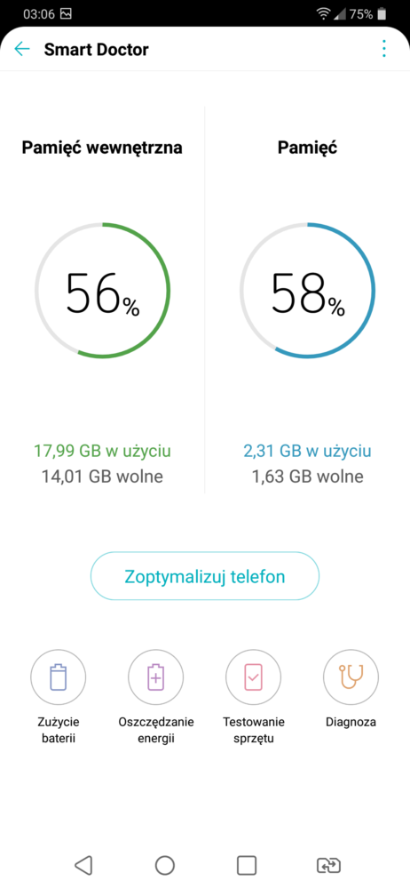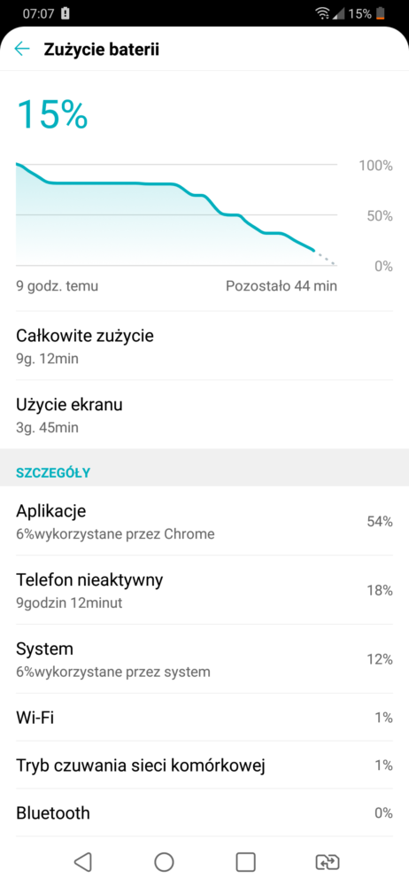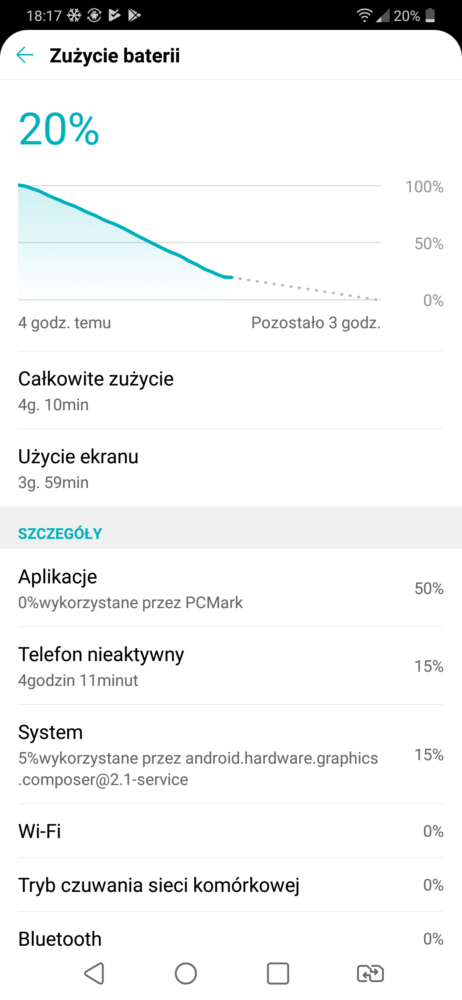 Podczas prac nad modelem G7 Fit firma LG, zadbała też aby można było długo obyć się bez dostępu do gniazdka elektrycznego. Bateria Li-Polymer o pojemności zaledwie 3000 mAh i 6,1″ wyświetlacz, zapowiada częste podpinanie do ładowarki. I faktycznie jest średnio. Akumulator wytrzymał w trybie online na pełnej jasności wyświetlacza około czterech godzin.