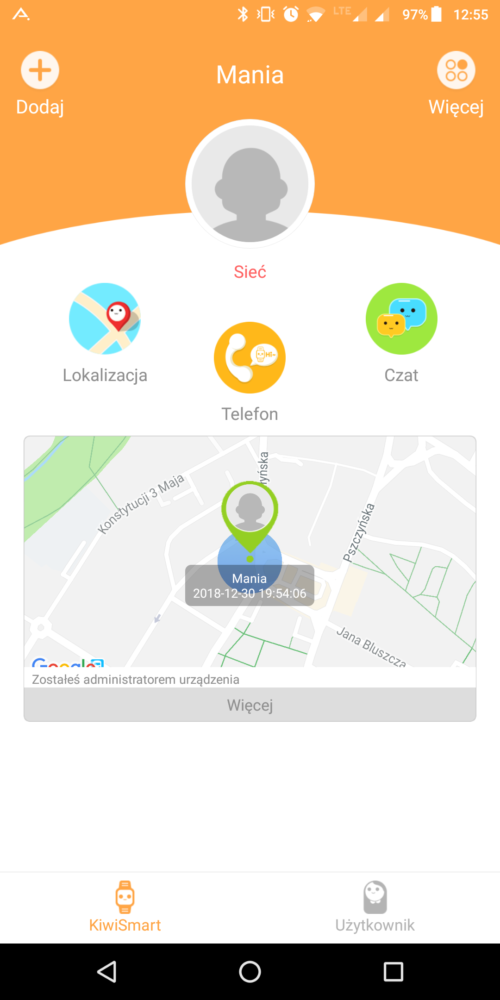 Przejdźmy do aplikacji.. Na początek trzeba założyć swój profil a po założeniu przypisać do niego zegarek skanując naklejkę umieszczoną na spodzie smartwatcha. Po poprawnym skonfigurowaniu ukazuje nam się dość proste i przejrzyste menu aplikacji. Na głównym „pulpicie” znajdziemy mapkę z szybkim podglądem do aktualnej pozycji zegarka, trzy ikonki: lokalizacja – przenosząca nas do dużej mapy z podglądem lokalizacji, telefon – wyświetlający numer telefonu jaki znajduje się w smartwatchu z możliwością wykonania połączenie, oraz chat – umożliwiający nagrywanie, przysyłanie i odbieranie wcześniej wspomnianych notatek/wiadomości głosowych. Owe notatki mogą być maksymalnie 15 sekundowe. U góry z prawej strony mamy zakładkę „więcej” przenoszącą nas w nieco bardziej rozbudowane menu i funkcje dodatkowe. Znajdziemy tak następujące funkcje: