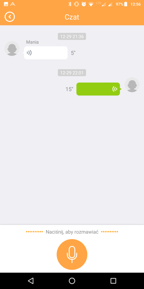 Przyciski 2 oraz dwa służą do wybierania przypisanych do nich numerów telefonów – wystarczy dłużej przytrzymać i wybierany będzie przypisany numer. Krótkie wciśnięcie klawisza dolnego (2) daje dostęp do książki telefonicznej a raczej bazy max 12 numerów które z aplikacji możemy udostępnić naszemu dziecku by mogło się z nimi kontaktować. Po dłuższym przytrzymaniu środkowego przycisku możemy nagrać max 15 sekundową notatkę głosową która zostanie wysłana i odebrana przez użytkownika aplikacji (rodzica). Taką wiadomość głosową można również wysłać z poziomu aplikacji. Po wysłaniu takiej notatki na wyświetlaczu zegarka pojawi się informacja o odebraniu wiadomości głosowej i by ją odsłuchać w dowolnym momencie wystarczy krótkie wciśnięcie przycisku SOS. Dodać należy że taką wiadomość głosową odsłuchać można tylko raz. Po odsłuchaniu zostaje ona usunięta ze smartwatcha. Co Ciekawe trzykrotne szybkie wciśnięcie środkowego przycisku daje nam dostęp do niezbyt rozbudowanego menu gdzie przechodzimy o kolejną pozycję wciskając przycisk SOS a akceptując 1. Jest to nieco uciążliwe lecz w zasadzie nie trzeba tam nic zmieniać. Dźwięk dzwonka czy powiadomienia jest jeden i nie można go zmienić tak samo jak poziomu głosu więc równie dobrze owego menu mogło by po prostu nie być.