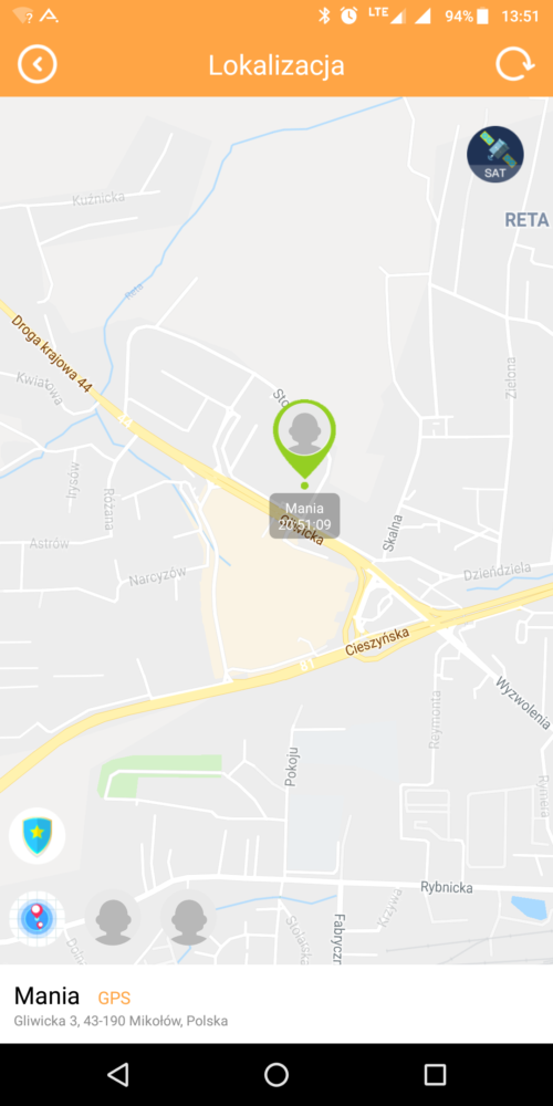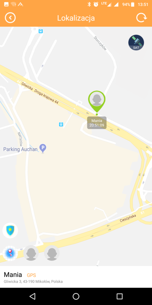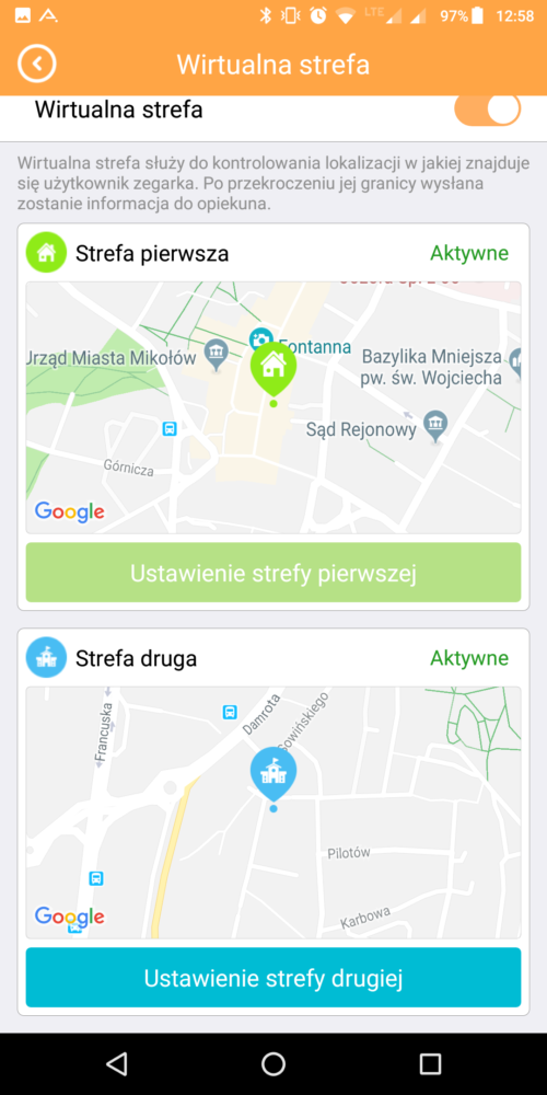 – wirtualna strefa – możemy ustawić dwie strefy o średnicy 500-700 metrów w których znajdować się będzie nasze dziecko. Po przekroczeniu strefy wyświetlony zostanie za pomocą aplikacji alert o tym informujący.