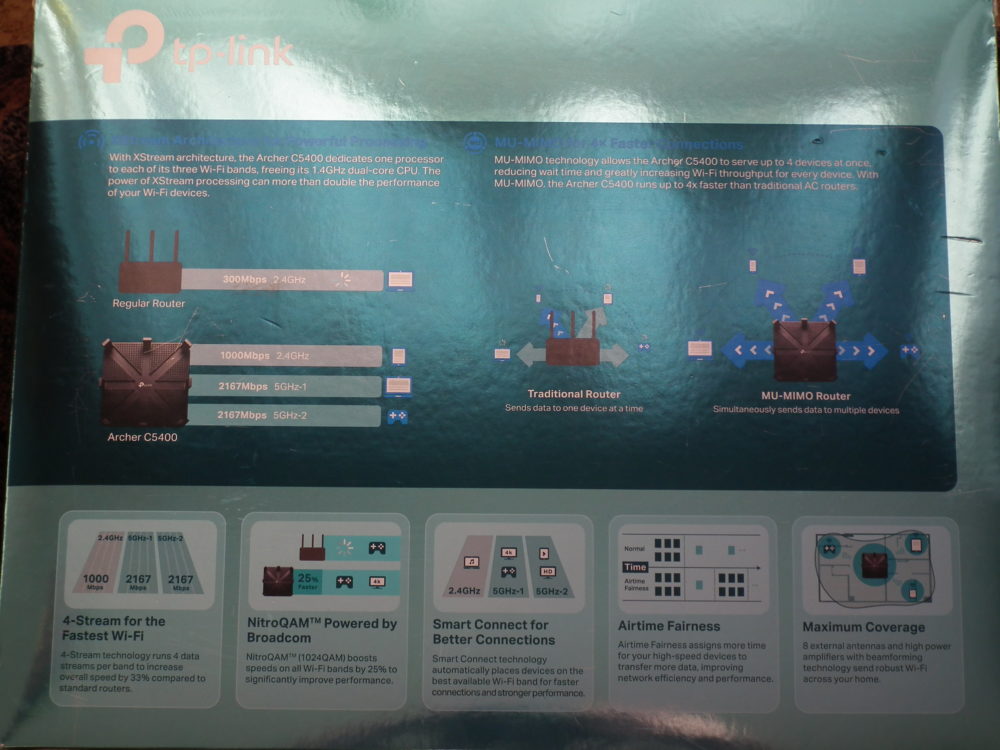 Testowany router TP-Link udostępnia trzy pasma sieci bezprzewodowej o łącznej prędkości 5334Mb/s, dwie oddzielne sieci bezprzewodowe w pasmach 5GHz-1 & 5GHz-2 (2167Mb/s każde) oraz 2,4 GHz (1000Mb/s). Dzięki czemu możemy wykorzystać jedno z pasm do gier bez spowalniania reszty sieci. Technologie NitroQAMTM (1024-QAM) oraz 4-Stream zapewniają maksymalne prędkości Wi-Fi we wszystkich pasmach wyższe o 25%. Smart Connect automatycznie wybiera najlepsze pasmo dla każdego z urządzeń. Osiem anten oraz technologia Beamforming pozwalają na wykrycie lokalizacji połączonych urządzeń i wysłanie silniejszego sygnału w ich kierunku, co umożliwia osiągnięcie stabilnego połączenia, nawet w wymagających warunkach. Poza tym urządzenie oferuje szereg przydatnych opcji, w tym tworzenia sieci bezprzewodowej dla gości (zarówno w paśmie 2.4 jak i 5GHz), kontrolę pasma w oparciu o adres IP, a technologia MU-MIMO zwiększa wydajność czterokrotnie komunikując się jednocześnie z czterema urządzeniami.