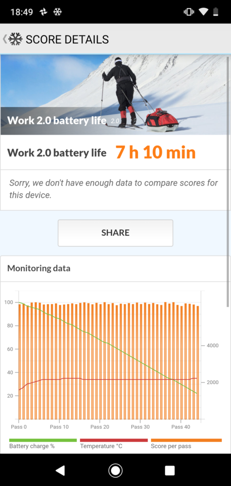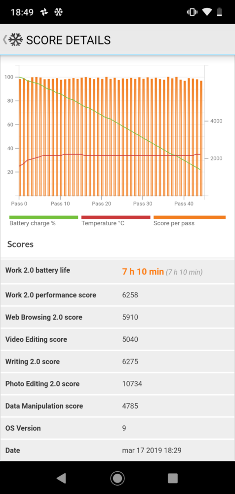 Niewymienny akumulator o pojemności 3000 mAh nie zaskoczył w sposób negatywny, ale nie zrobił też na mnie bardzo pozytywnego wrażenia. Całodzienne intensywne użytkowanie telefonu przy jednoczestnym korzystaniu z danych pakietowych skutkowało koniecznością podpięcia smartfona do ładowarki późnym wieczorem. Po ograniczeniu transferu 3G i zmniejszeniu jasności ekranu urządzenie pracowało 2 dni. W trybie czuwania telefon pobiera minimalną ilość energii. Oczywiście nie omieszkałem przeprowadzić standardowych testów w aplikacji PCMark, przy pełnej jasności ekranu, z którego wynikami możecie zapoznać się poniżej: