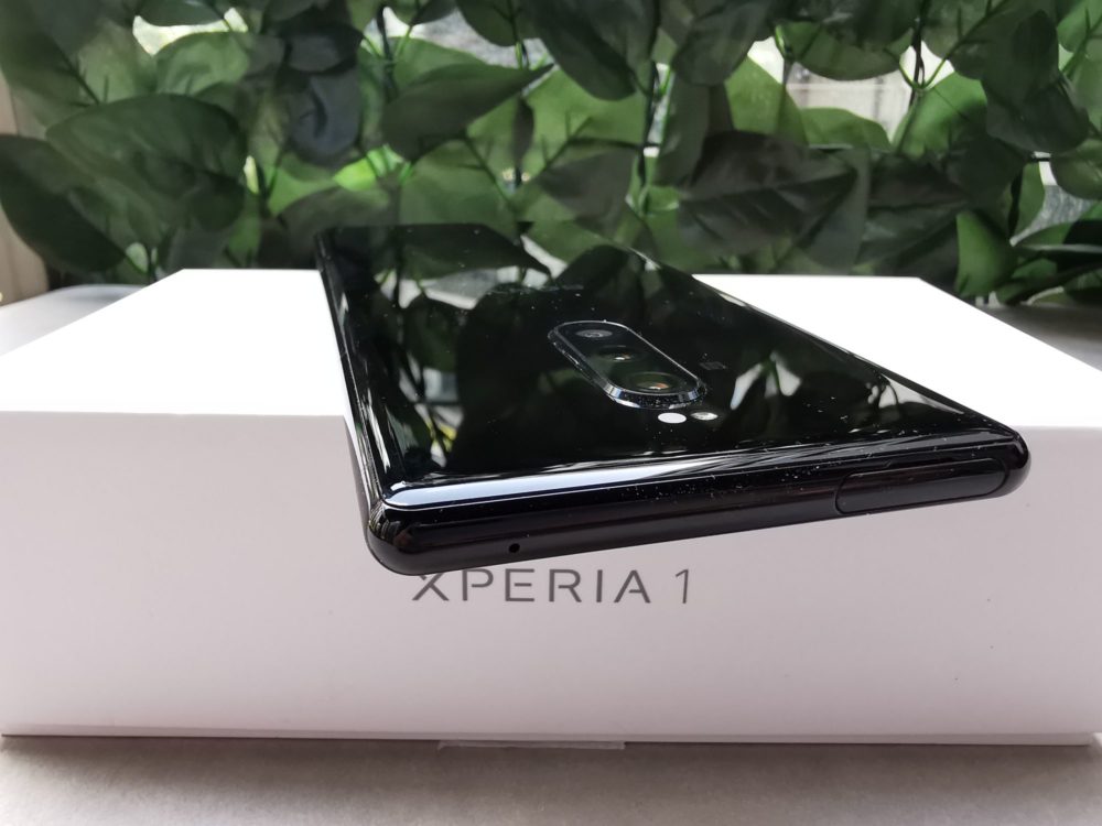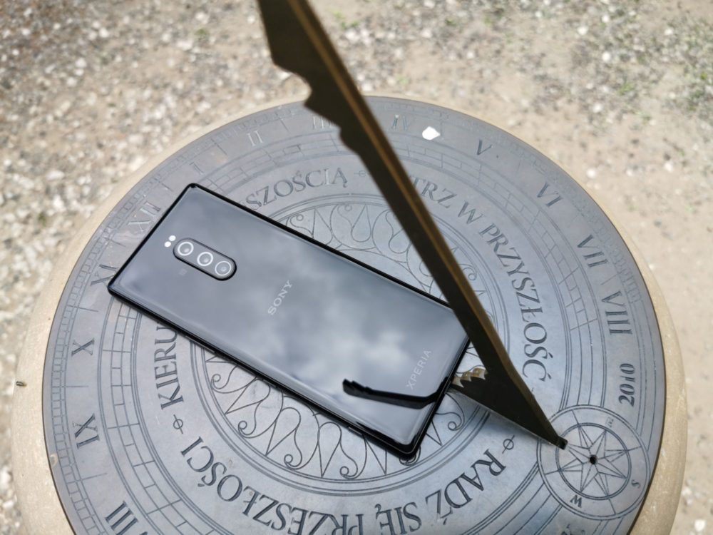Na uwagę zasługuje również tył smartfonu. Obudowa Xperia 1 została wykonana oczywiście ze szkła Gorilla Glass 6 i aluminiowych ramek. Co więcej jest wodoszczelna – IP65/68. Za to duży plus. Ponad to, znajdziemy tutaj 3 obiektywy 12 MP, które ustawiono pionowo idealnie na środku, co daje mu ładny symetryczny wygląd. Same aparaty zostawmy sobie jednak na nieco później. Niemniej sama obudowa jest błyszcząca i zauważyłam na niej minimalne ryski, a do tego wokół aparatu zbiera się sporo brudu. Nie zostaje nam nic innego jak zaopatrzyć się w odpowiednie etui. Szkoda tylko, że producent nie dostarcza takiego w opakowaniu.