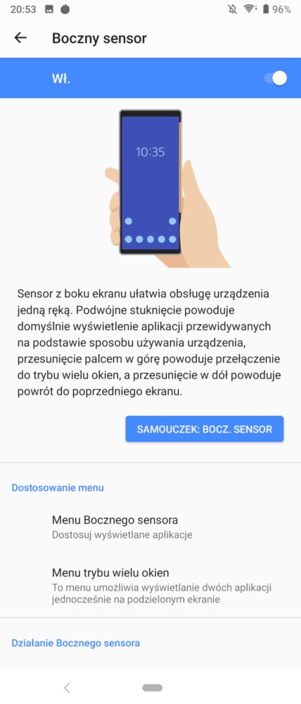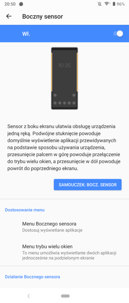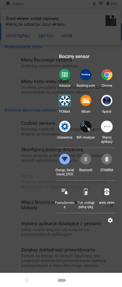 Jak jesteśmy przy ekranie, to warto tutaj wspomnieć o jeszcze jednej funkcji – a mianowicie bocznym menu, które umożliwi nam szybszy dostęp od ulubionych aplikacji, a co więcej ułatwi obsługę telefonu jedną ręką. Osobiście zawsze wyłączam tą funkcjonalność z racji, że czasami potrafi przeszkadzać i wyskoczyć najmniej odpowiednim momencie. Nie mniej warto spróbować jej używać, a nóż przypadnie Wam do gustu.