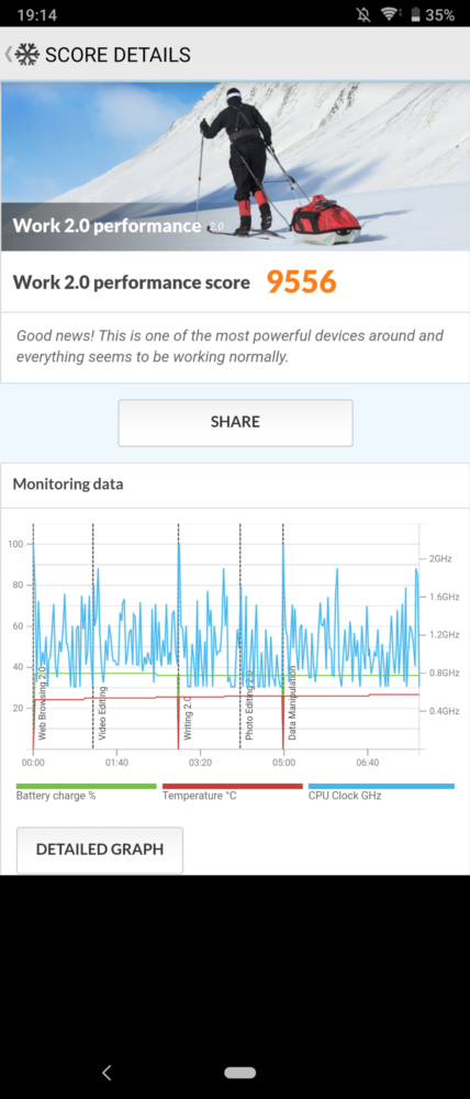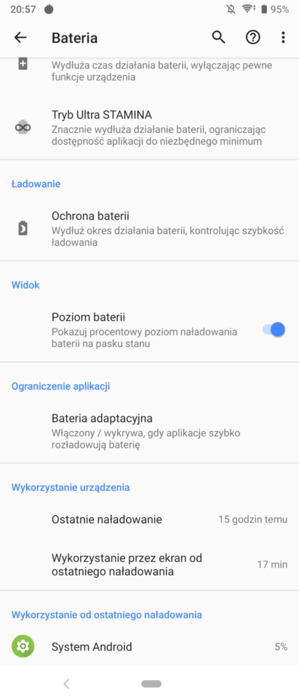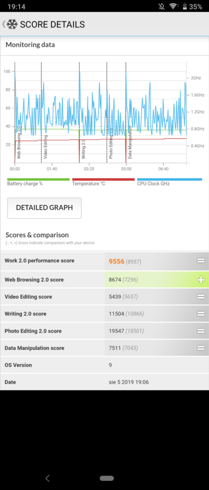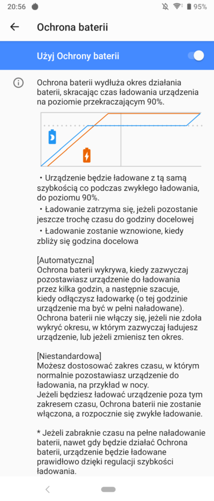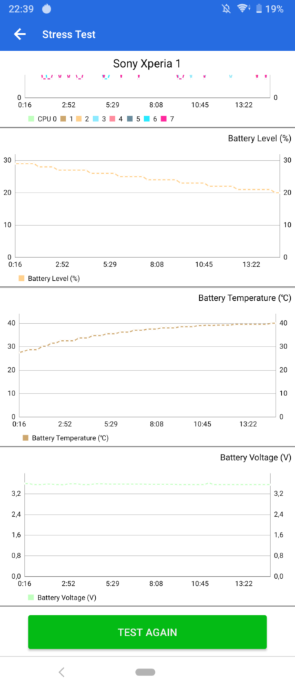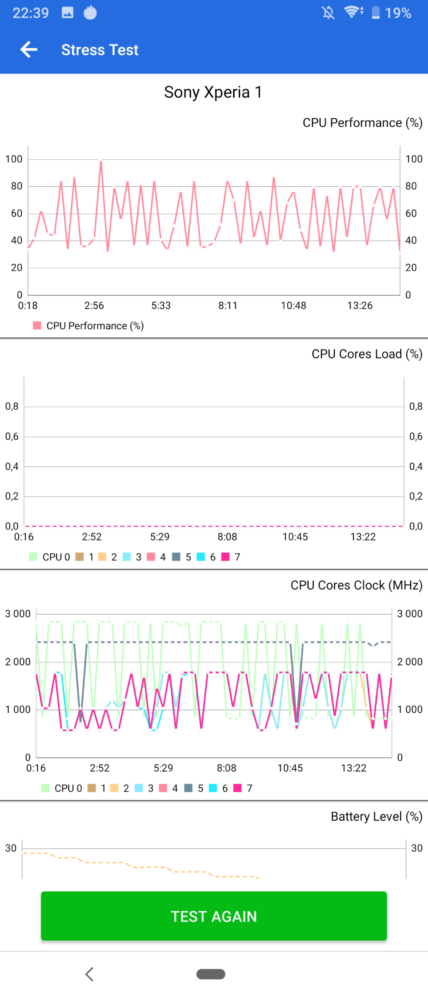 Zważywszy na fakt, że Sony Xperia 1 posiada dosyć spory ekran, to powyższa pojemność baterii nie jest czymś co oczekiwałby użytkownik. Sporo tańsze telefony otrzymują już baterię 4000 – 5000 mAh. Niestety nie udało mi się wykonać testu aplikacją PC Mark, gdyż aplikacja przy osiągnięciu około 40% po prostu się wyłączała. Niemniej telefon przy intensywnym użytkowaniu wystarczy nam na kilka godzin pracy. Natomiast przy standardowym użytkowaniu (kilka rozmów, niewielkie użytkowanie mediów społecznościowych itp.) może pozwolić nam na użytkowanie telefonu na jednym ładowaniu nawet 1,5 dnia. Na szczęście producent dostarczył do zestawu szybką ładowarkę UCH32, która pozwala na naładowanie baterii do 50% już w 30 minut. Nie jest to najszybsze ładowanie dostępne na rynku, ale całkowicie wystarcza.