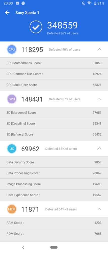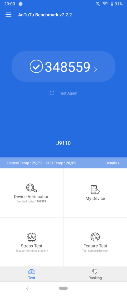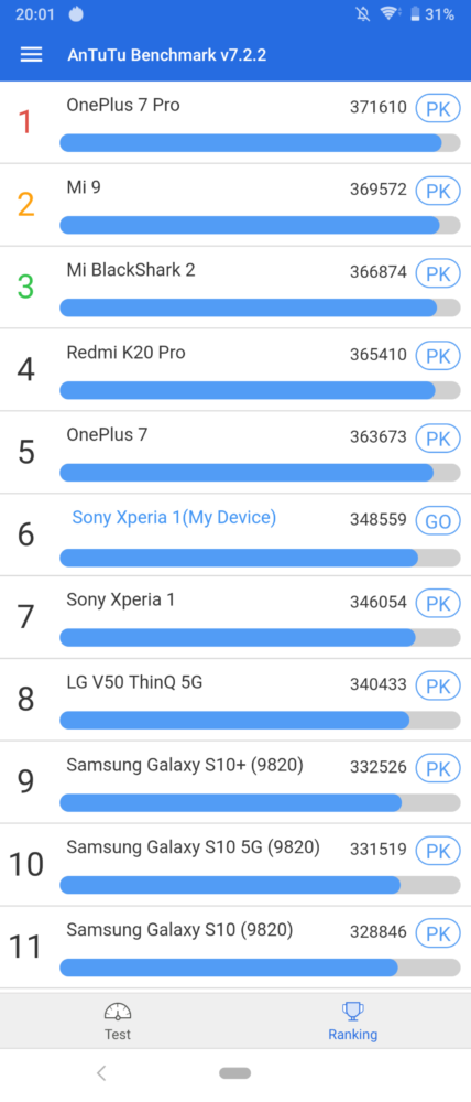 Testowany smartfon został wyposażony w procesor Qualcomm® Snapdragon™ 855 Mobile Platform, 6 GB RAM-u oraz 128 GB na dane. Czy to mało? Dla większości użytkowników, jest to ilość wystarczająca, a jeśli komuś mało, to mamy możliwość jej rozbudowy poprzez kartę microSDXC do 512GB. Benchmark AnTuTu wyświetlił ponad 348 tys. punktów. To świetny wynik, który uplasował Xperię 1 na wysokiej 6 pozycji w rankingu AnTuTu. A jak to urządzenie działa w trakcie typowego użytkowania? Również bardzo dobrze. Wszystko działa płynnie i bardzo szybko. Nie zauważyłam aby telefon się dławił czy zwalniał. Krótko mówiąc jest dobrze.