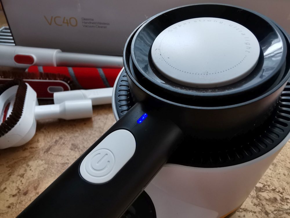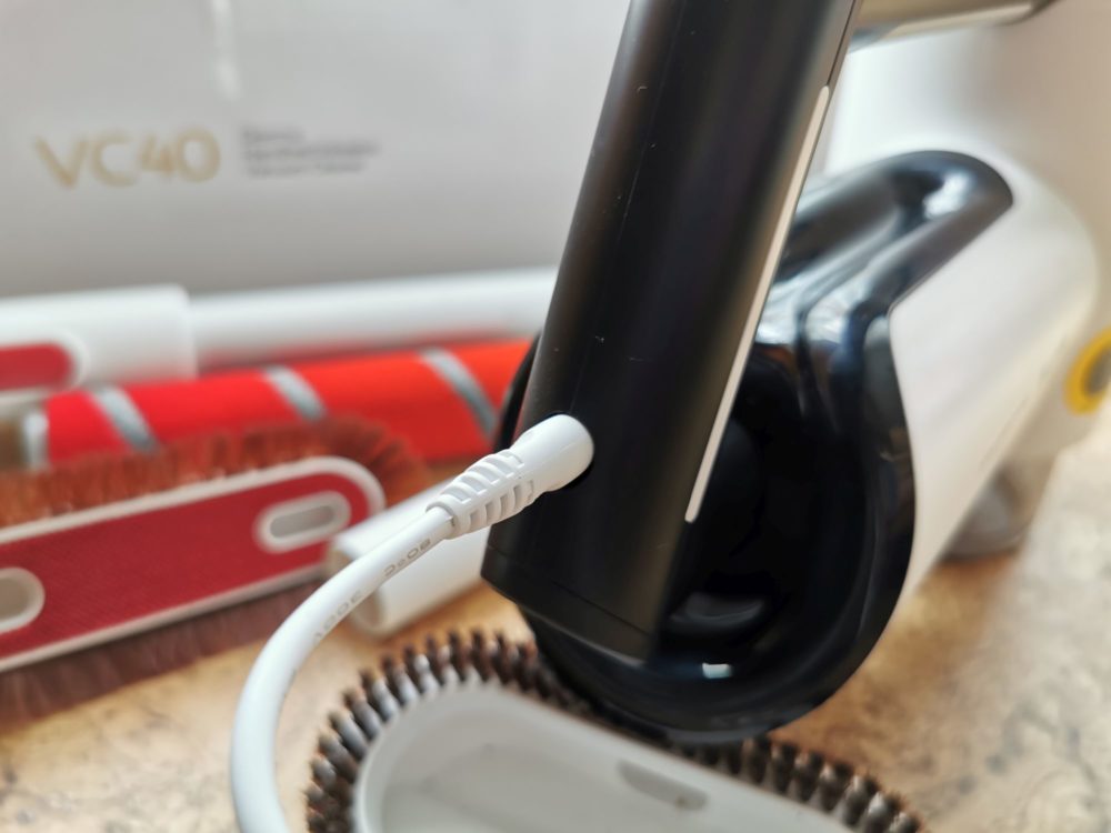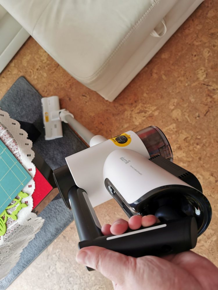 Zacznijmy od tego, że Deerma VC40, podobnie jak VC20 jest bardzo wygodnym urządzeniem w użytkowaniu. Trzyma się go bardzo wygodnie w jednej ręce zarówno, gdy odkurzamy podłogi jak i w skróconej wersji podczas sprzątania kanapy czy samochodu. VC40 jest sporo cięższy niż VC20, ale mimo tego, nadal nie wpływa to na komfort użytkowania. To co znacząco wyróżnia VC40 względem VC20, to jego moc, która w testowanym urządzeniu wynosi 250 W, czyli 2,5 razy większa niż w poprzedniku. Moc tą można odczuć na każdym kroku. VC40 dużo lepiej poradził sobie, nie tylko z kurzem, piaskiem czy paprochami w maszynie, które zostały po szyciu, ale również grubszym brudem czy włosami wbitymi w dywan. Za to duży plus. Co więcej w VC40 mamy do dyspozycji kilka dodatkowych szczotek, których nie znajdziemy w VC20, a które dodatkowo pomogą w nam lepszym utrzymaniu porządku w naszym mieszkaniu. Względem VC20 otrzymamy również dodatkowe szczotki takie jak z włókna węglowego, z miękkiego aksamitu, szczotkę elektrostatyczną oraz miękką szczotkę. Nie znajdziemy tutaj natomiast turbo szczotki. Najczęściej jednak będziemy używać szczotkę 2w1 oraz z włókna węglowego. Krótko mówiąc odkurzacz nadaje się spokojnie do codziennego użytkowania w niewielkim mieszkaniu ( ok 50-60 m). Bez problemu wysprzątałam kurze na podłodze, krótki i długi dywan, niewielkie liście, które opadły z kwiatków na balkonie, piasek w samochodzie, kaloryfer podłogowy czy nici pozostawione w maszynie po zakończonym szyciu. Co więcej miękka szczotka idealnie sprawdziła się również do mojej podłogi korkowej. Również czas pracy odkurzacza w pełni wystarczył mi do wysprzątania moich 50 metrów, a po zakończonych pracach podłączyłam akumulator do prądu, a już po około 2,5 h mogłam ponownie rozpocząć porządki. To dużo szybciej niż w VC20, w którym na pełne ładowanie należało poczekać aż 4h. Co więcej dioda umieszczona na górze jednostki głównej cały czas informowała mnie o poziomie rozładowania akumulatora.