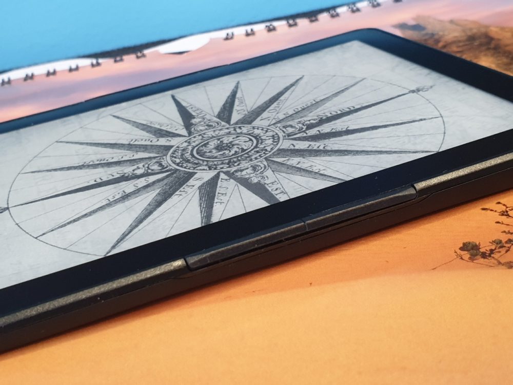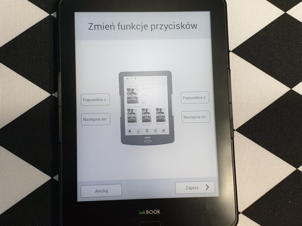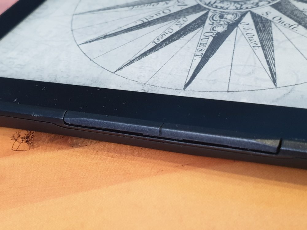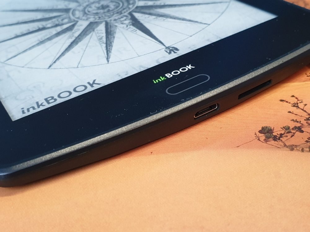 Pod ekranem producent umieścił dotykowy dwukolorowy przycisk (podświetlany na zielony przy dotyku oraz czerwony podczas ładowania). Przycisk Powrotu pozwala wyjść z bieżącego widoku, powrócić do poprzedniego katalogu, lub do ekranu głównego. Czytnik ma też programowalne przyciski (po dwa na każdym boku) – dzięki temu możemy przerzucać elektroniczne strony tak, jak nam to wygodnie. Oczywiście możemy je skonfigurować w ustawieniach według własnych preferencji. Spód czytnika to gniazda – microUSB i na karty microSD. Z tyłu zaś znajdziemy przycisk „Power”, aby włączyć/wyłączyć urządzenie. Korzystanie z niego jednak wymaga przyzwyczajenia, jest głęboko usadowiony i trudno wyczuwalny. Sam ekran podzielony jest na trzy „niewidoczne” kolumny. Dotknięcie lewej pozwala wrócić do poprzedniej strony. Dotknięcie środkowej prowadzi do głównego menu i/lub z niego wychodzi. Dotknięcie prawej pozwala przejść do następnej strony.