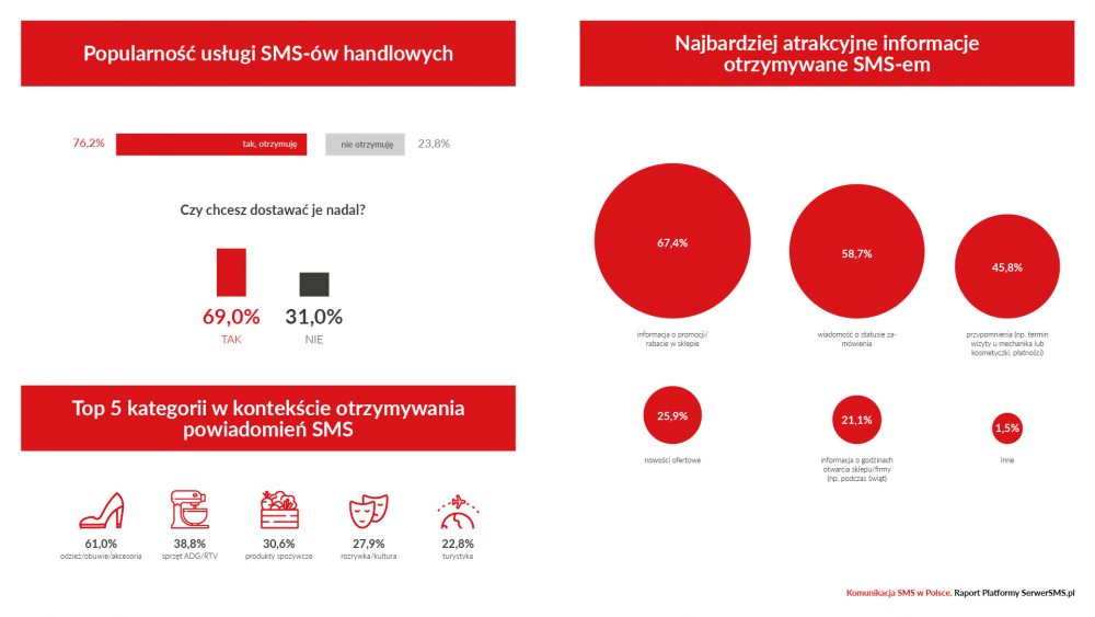 SMS stanowi ważny kanał komunikacyjny firm z klientami. 3 na 4 ankietowanych otrzymuje SMS-y promocyjne od firm lub sklepów i zdecydowana większość chce je otrzymywać nadal (69% Polaków), przy czym najchętniej raz w tygodniu – tak deklaruje 40% z nich. Najbardziej interesują nas: