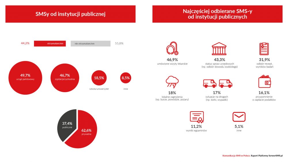 Z roku na rok gminy czy urzędy stają się są coraz bardziej przyjazne w kontakcie z obywatelami, co doceniają niemal wszyscy badani (aż 97% uznaje SMS-y od instytucji publicznych za bardzo przydatne lub przydatne). Niemal połowa ankietowanych (44,2%) deklaruje, że w ciągu roku otrzymała wiadomość tekstową od instytucji publicznej, przy czym głównie: