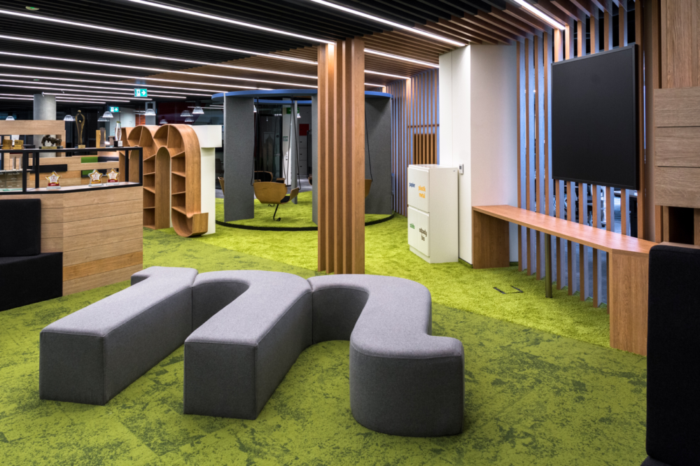 Wnętrze nowego biura mBanku zaprojektowano zgodnie z najnowszymi trendami, na podstawie konsultacji z pracownikami oraz wniosków z pilotażu, w którym testowano najnowsze rozwiązania biurowe.