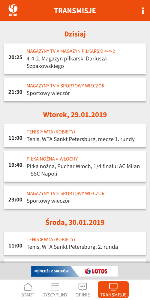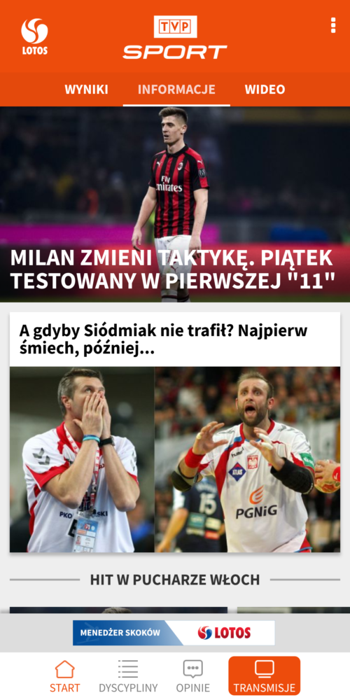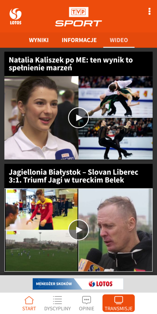 Telewizja Publiczna także wypuściła swoją aplikację sportową. TVP Sport podzielona została na 3 główne sekcje: Wyniki, Informacje i Wideo. Każda z tych sekcji może zostać przefiltrowana wg. jednej z kilkunastu dostępnych dyscyplin sportowych. Lista newsów jest dosyć obszerna. Warto zwrócić też uwagę na sekcję wideo, w której znajdziemy wideorelacje z różnych sportowych wydarzeń oraz wywiady ze sportowcami. W sekcji „opinie” możemy przeczytać setki wpisów od komentatorów sportowych, których listę możemy przejrzeć w aplikacji. TVP Sport emituje relacje z wielu rozgrywek sportowych i część z nich znajdziemy też na żywo w aplikacji mobilnej. Wszystkie nadchodzące transmisje możemy przejrzeć na liście. Szkoda tylko, że ta lista jest dosyć krótka i nie odpowiada programowi TVP Sport nadawanemu sygnałem naziemnym lub satelitarnym. To czego zdecydowanie brakuje w aplikacji to funkcji powiadomień o konkretnej dyscyplinie lub wydarzeniu. Niektórzy użytkownicy narzekają natomiast na częste awarie streamingu wideo, które uniemożliwiają obejrzenie transmisji na żywo do końca.