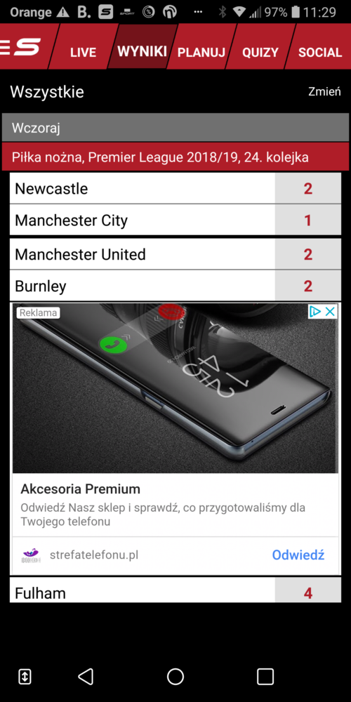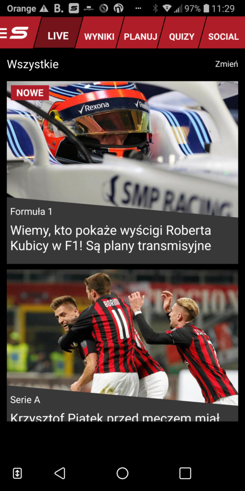 Aplikacja Sport.pl przygotowana została przez zespół Agory. Jest dostępna na platformy iOS oraz Android. Sport.pl Live chwali się przede wszystkim wynikami na żywo. Możemy wybrać sobie żądaną dyscyplinę a aplikacja na żywo powiadomi nas o wynikach rozgrywki. W sport.pl mamy dostęp do wyników sportowych z wielu dyscyplin i lig w tym Ligi Mistrzów, Ekstraklasy. W sumie aplikacja daje nam dostęp następujących grup: piłka nożna, sporty zimowe, moto, tenis, siatkówka, koszykówka, piłka ręczna, hokej, boks i inne. Jeśli chcemy otrzymać powiadomienia to warto skorzystać z funkcji planowania, gdzie nadchodzące wydarzenie można dodać do swojego kalendarza w aplikcji. Inną ciekawą funkcją są quizy, dzięki którym można sprawdzić swoją wiedzę z różnych dyscyplin sportowych. Quizy dotyczą np. siatkówki, historii mundialu, ligi NHL oraz igrzysk olimpijskich. Dla fanów sportu – fajna rozrywka. Szkoda jednak, że na przełomie 2018/2019 roku aplikacja odnotowała spore problemy techniczne z aktualizacją danych co szybko zdobyło odzwierciedlenie w gorszych komentarzach. Mimo to, sport.pl Live ma nadal dobre oceny w Google Play, które kształtują się na poziomie 4.6