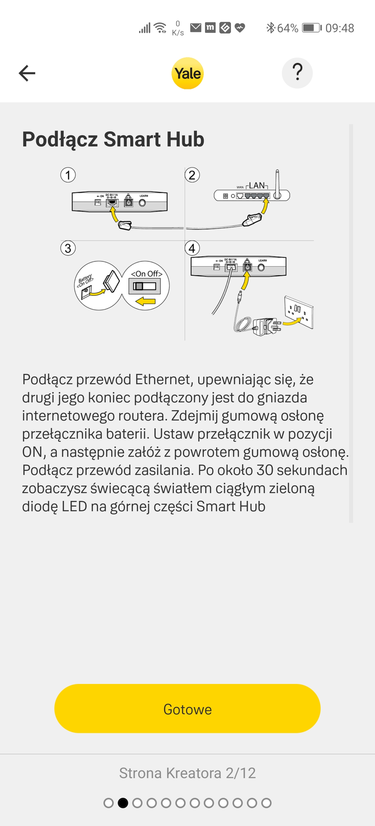 Instalację rozpoczynamy od podłączenia smarthuba do Internetu kablem Ethernet. Gdy na urządzeniu świeci się zielona ikonka możemy pobrać aplikację Yale Smart Living z marketów Appstore lub Google Play i rozpocząć konfigurację alarmu. Wszystkie urządzenia w zestawie są już zlinkowane ze smarthubem, więc nie musimy ich ręcznie dodawać. Smarthub wyposażony jest w zintegrowaną baterię, która przyda się w przypadku braku zasilania.