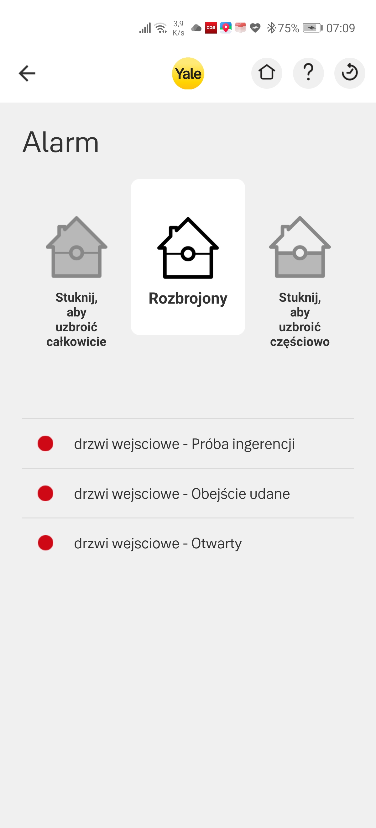 Przydatną funkcją jest możliwość częściowego uzbrojenia alarmu. Pozwala ona na stworzenie dwóch scenariuszy działania dla których czujniki będą wywoływać różne alarmy. Przykładowo – przy alarmie w pełni uzbrojonym każdy ruch zarejestrowany przez czujnik wywoła natychmiastowy sygnał alarmowy. W przypadku alarmu częściowo uzbrojonego, możemy wyłączyć część czujników – pozostawić aktywne na parterze a wyłączyć na piętrze gdzie akurat przebywamy. Niestety, zarządzanie tymi ustawieniami nie takie proste jak być powinno. System pomocy w aplikacji mobilnej też nie pomaga w tej kwestii za bardzo i nie wiadomo co oznaczają poszczególne nazwy opcji uzbrojenia alarmu: pominięcie domu, dostęp do domu lub strefa wejścia. Dla wyjaśnienia – pominięcie domu oznacza, że czujka w trybie częściowo uzbrojonym nie wywoła alarmu. Z kolei czujka w strefie wejścia da nam 30 sek na rozbrojenie alarmu w obu trybach.