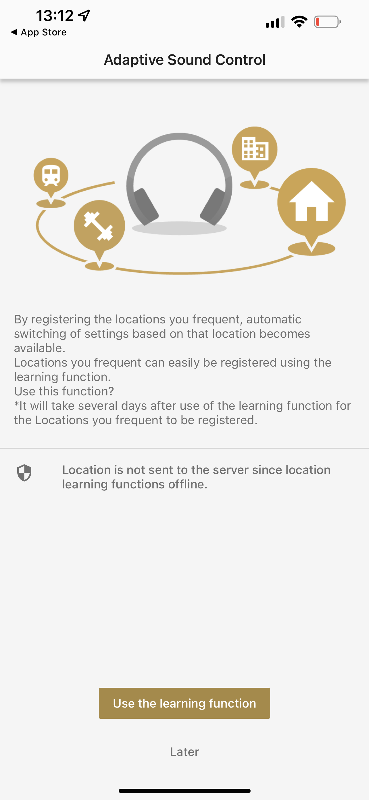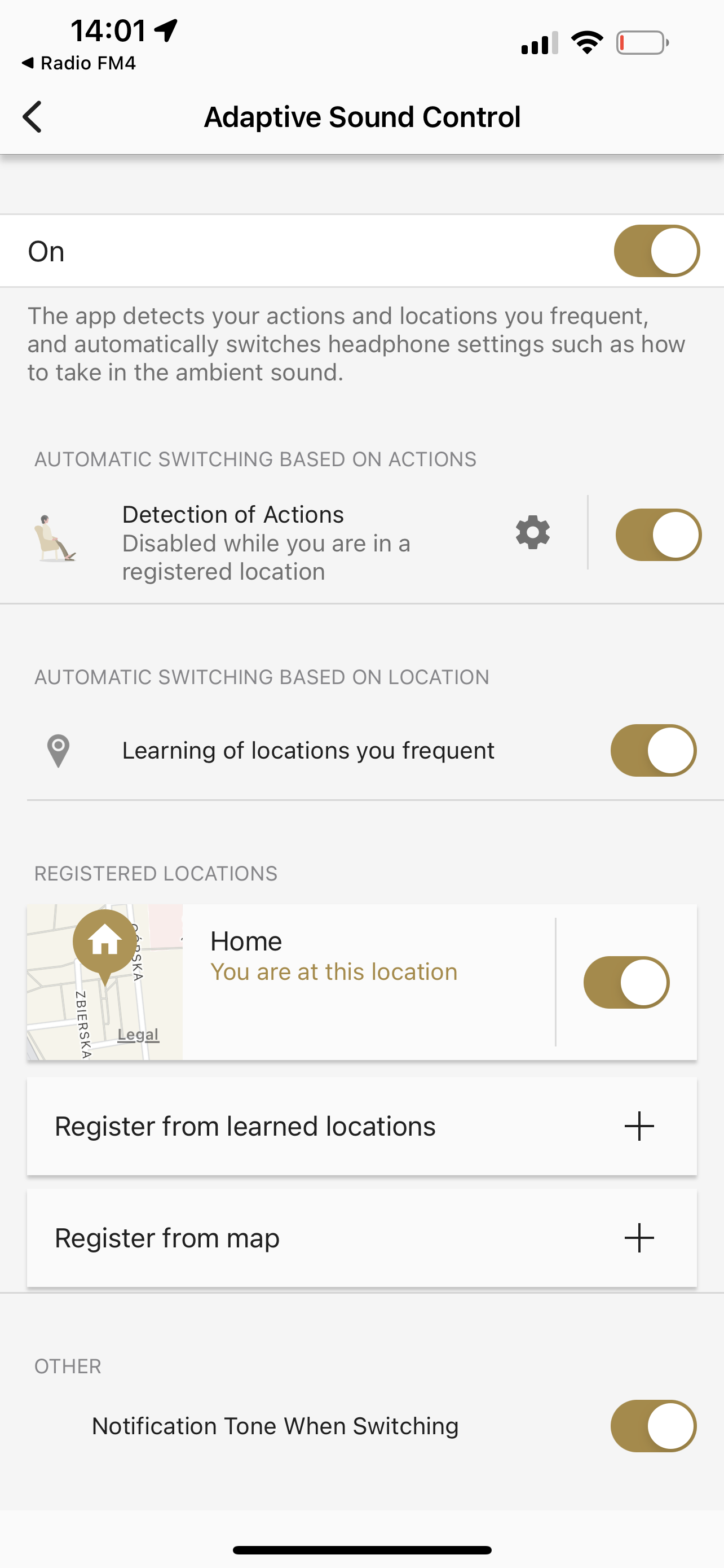 Kolejną interesującą funkcją jest „Adaptive Sound Control”. Funkcja ta analizuje nasze użycie słuchawek w różnych miejscach. W jednych chcemy skoncentrować się wyłącznie na muzyce, w innych włączamy dostęp dźwięków otoczenia, żeby móc lepiej orientować się w przestrzeni. Adaptive Sound Control zapisuje te dane wraz z dokładną lokalizacją telefonu i próbuje potem automatycznie dostosować prace słuchawek, gdy się poruszamy. Możemy stworzyć w aplikacji różne „lokalizacje” i ustawić dla nich różne parametry pracy słuchawek. W domy możemy np. wyłączyć wyciszanie dźwięków otoczenia i ustawić priorytet dla dźwięków mowy z otoczenia słuchawek. Wtedy w trakcie słuchania muzyki, głos członków rodziny będzie do nas lepiej docierał. W innych miejscach możemy stworzyć dla siebie inne zestawy parametrów pracy słuchawek.