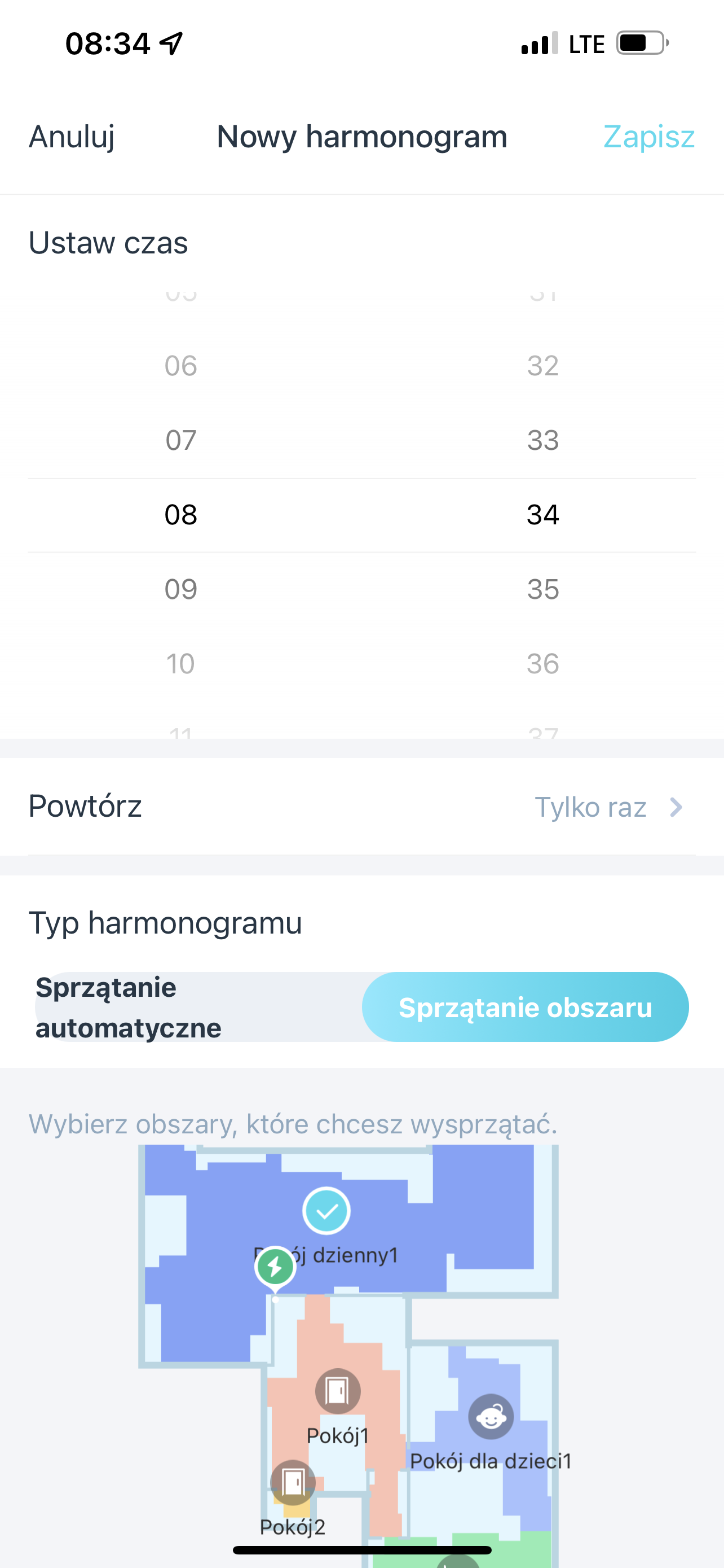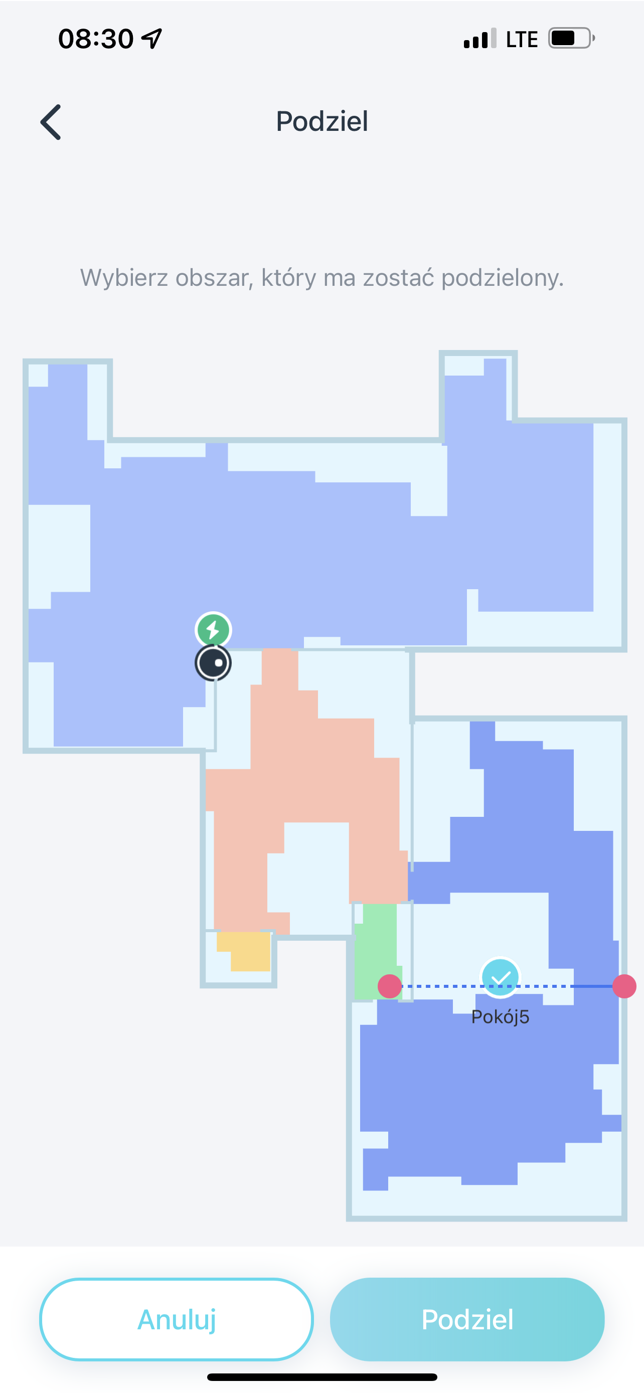 Gdy mapa była zrobiona, przystąpiłem do edycji stref wyłączonych z odkurzania lub mopowania oraz nadania nazw pomieszczeniom. Aplikacja daje tez możliwość łączenia lub dzielenia wykrytych pomieszczeń.