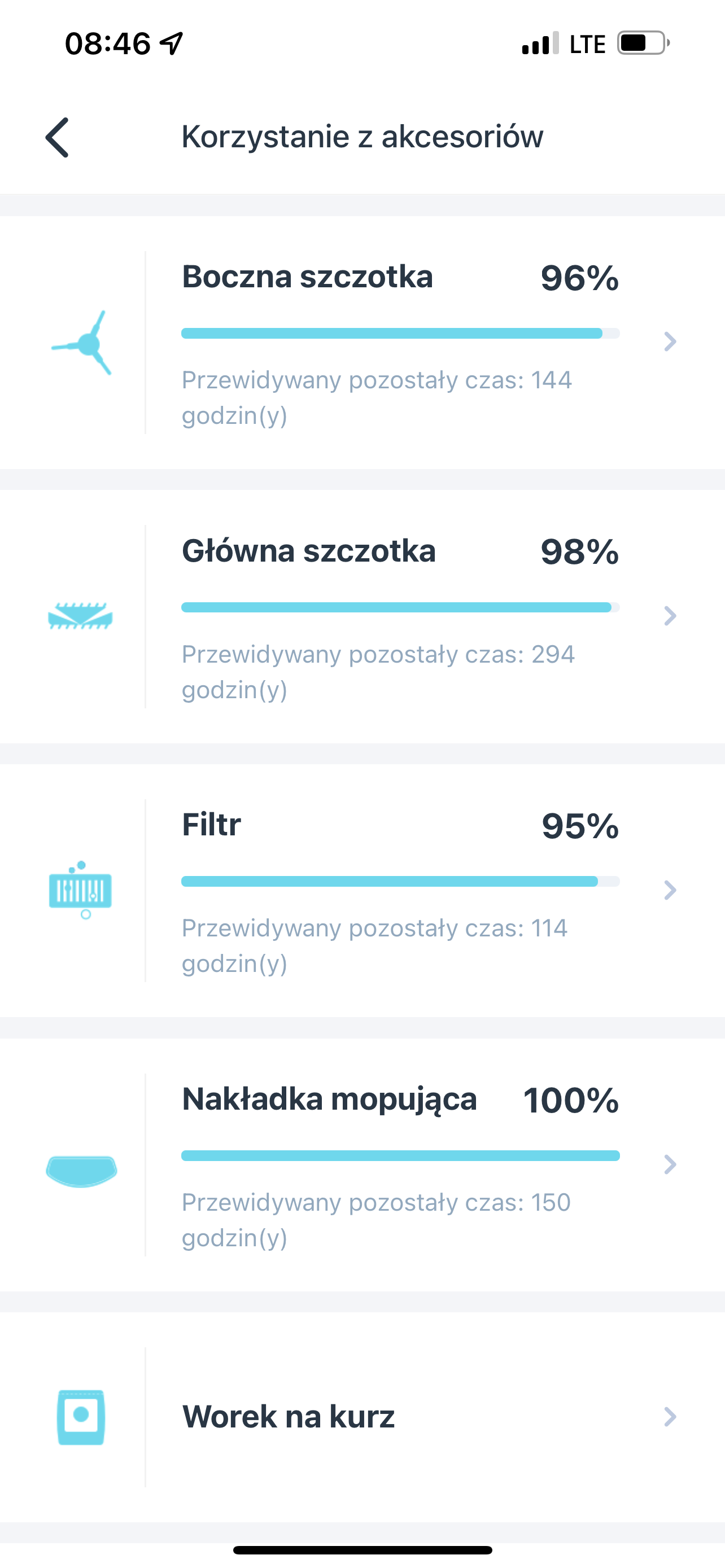 Aplikacja mobilna daje też dostęp do dziennika pracy odkurzacza oraz jego statystyk – możemy np. sprawdzić czy poprzedniego dnia w mieszkaniu było odkurzane lub ile łącznie metrów kwadratowych wysprzątał nasz yeedi. Przydatną funkcją jest też informacja na temat zużycia akcesoriów – filtra, obrotowych szczotek i ściereczki.