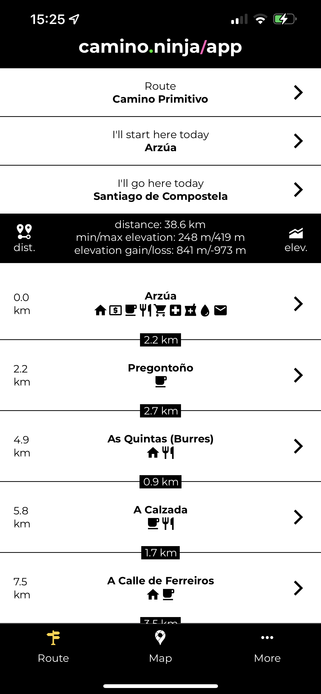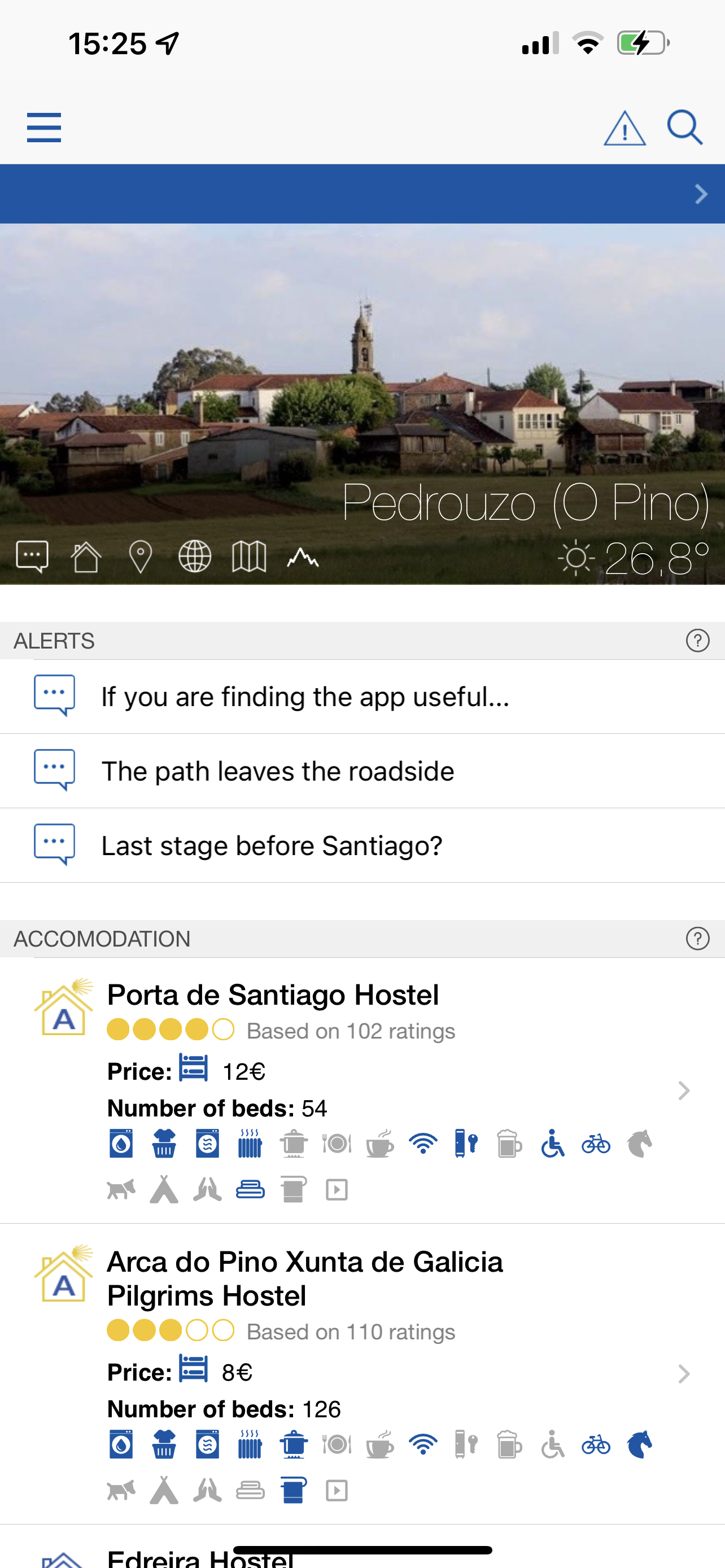 - Bardzo przydatne okazały się też aplikacje wyświetlające dostępne na trasie hostele i schroniska – tzw. „Auberge”. Dzięki nim, możemy lepiej zaplanować codzienną trasę marszu oraz zawczasu zabukować miejsce do spania. W sezonie letnim warto o tym pomyśleć, ponieważ jest wielu chętnych na miejsce do spania i może okazać się, że nie ma gdzie przenocować. Mi przydarzyło się raz, że musiałem spać w opuszczonej kaplicy, bo w miejscowości, w której chciałem przenocować nie było wolnych miejsc a najbliższy kolejny nocleg był 20 km dalej. Z aplikacji z których korzystałem polecam „Camino Ninja” oraz „Buen Camino”. Pierwsza aplikacja daje nam dostęp do prostego planera podróży i wyświetla trasę na mapie. Druga daje bardzo przydatny przegląd hosteli i schronisk wraz z danymi kontaktowymi. Ponadto, korzystałem też z aplikacji Booking.com do rezerwacji niektórych miejsc noclegowych w prywatnych hostelach.