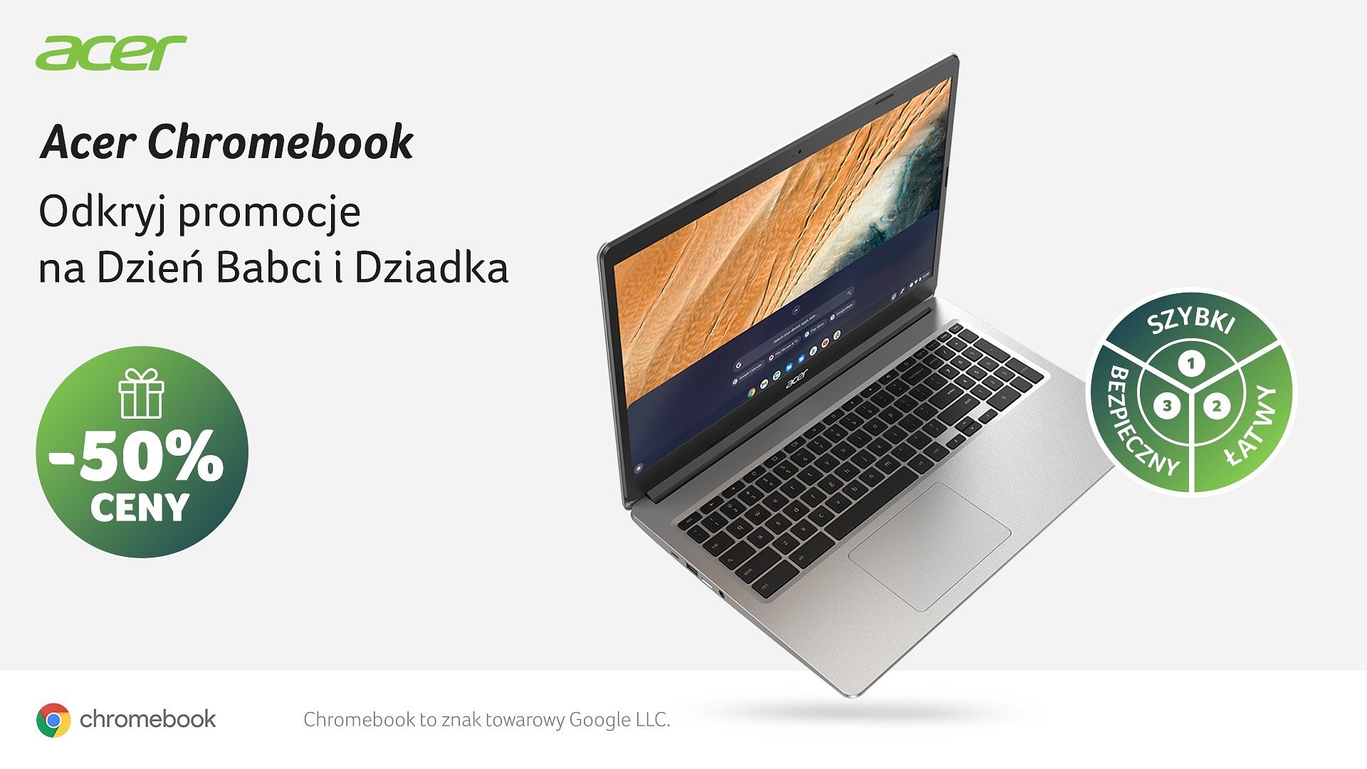 Szukasz pomysłu na prezent dla babci i dziadka z okazji ich święta? A może po prostu świetnej promocji na laptop dla siebie? W obu przypadkach Acer przygotował ofertę, której bardzo ciężko się oprzeć. Kilkadziesiąt modeli tego szybkiego, bezpiecznego i prostego w obsłudze laptopa Acer Chrombook zostało właśnie przecenionych aż o połowę ceny!