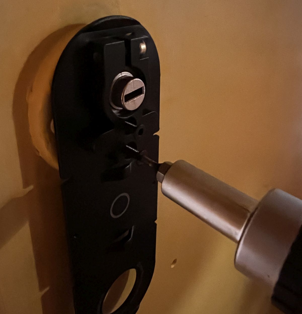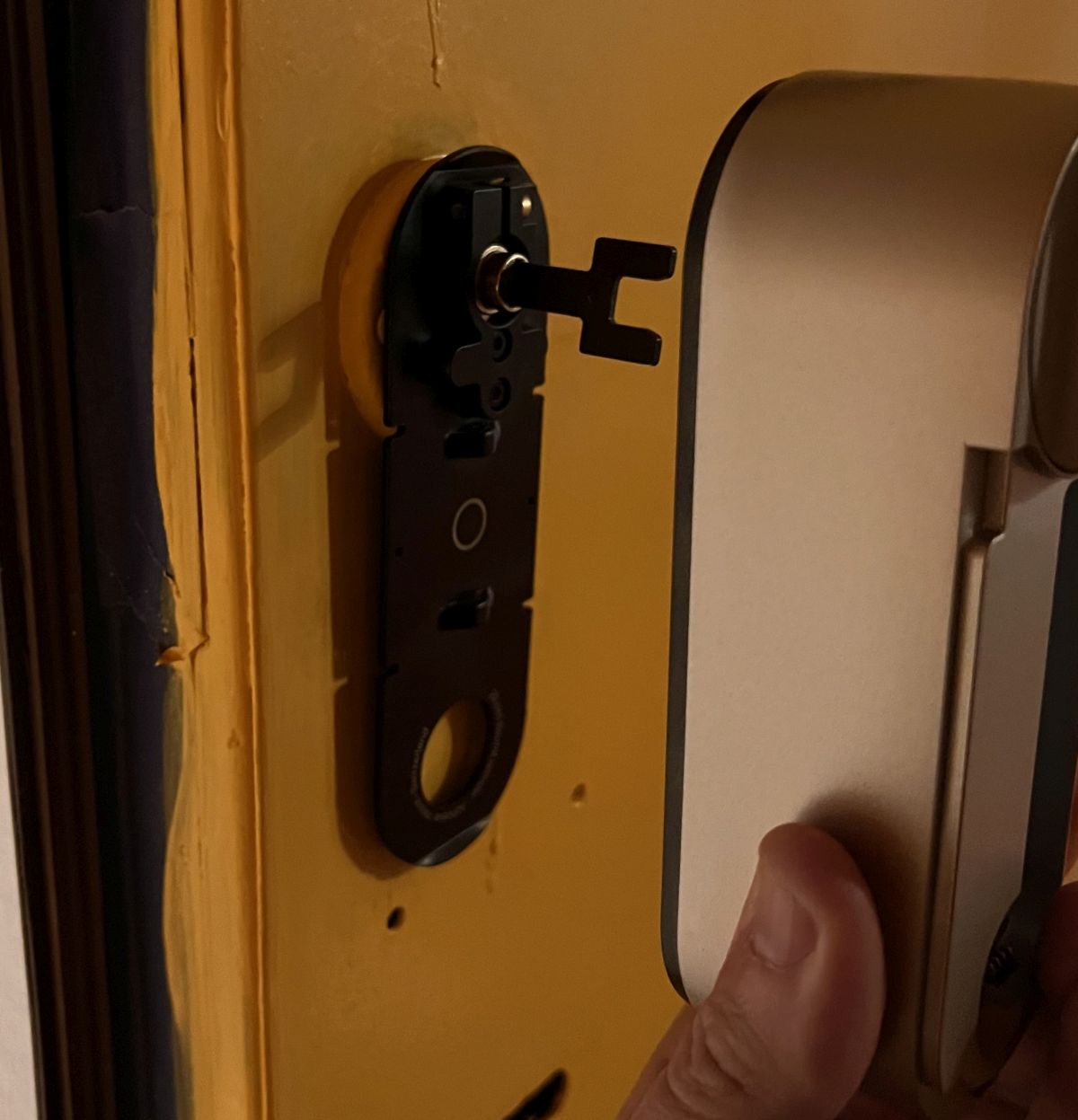 Po zamontowaniu wkładki uniwersalnej Yale przystąpiliśmy do montażu zamka Linus L2. Proces ten rozpoczynamy od zdjęcia magnetycznej pokrywy na baterie i usunięcia zabezpieczających folii, które uniemożliwiają przepływ prądu. Zamek Linus L2 nakładamy na wystającą część wkładki i dokręcamy śrubkami. Jeśli instalowana wkładka różni się od modelu wkładki Yale Linus, możliwe jest używanie dodatkowych śrub bocznych dla lepszego mocowania zamka.
