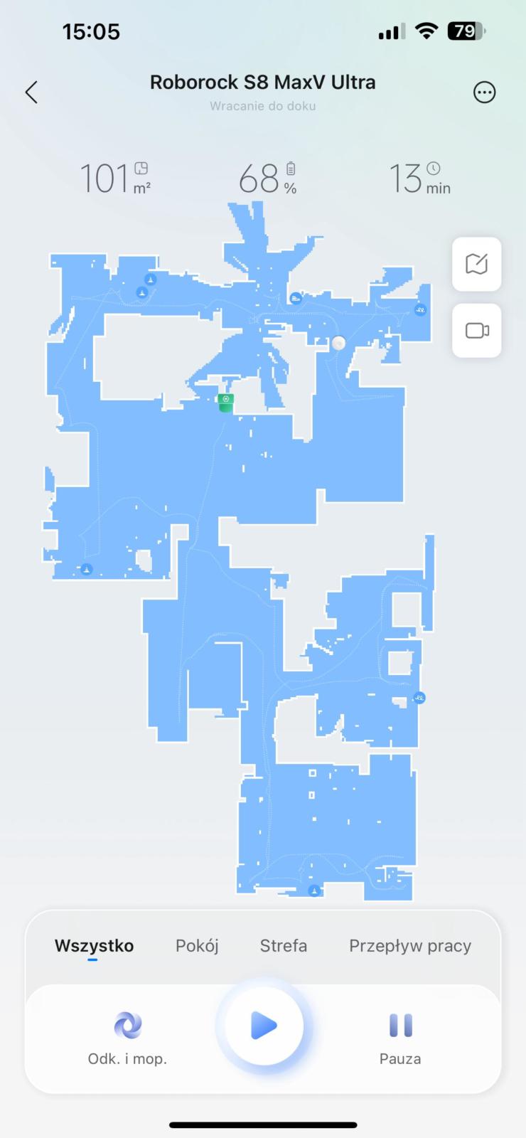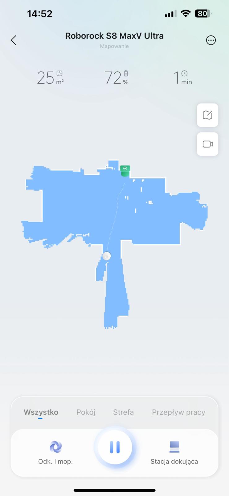 Pierwsze uruchomienie nie powinno stwarzać problemów. Pobieramy aplikację Roborock z Google Play lub Appstore a następnie umieszczamy wyświetlony kod QR przed kamerą odkurzacza. W ten sposób odkurzacz podpina się do naszej domowej sieci WIFI i zostaje sparowany z aplikacją mobilną. Po chwili można już rozpocząć tworzenie cyfrowej mapy. Byłem zaskoczony jak szybko była ona gotowa. Wystarczy, że S8 MaxV Ultra przejedzie przez pomieszczenie i po chwili jego obrys jest już widoczny na ekranie telefonu. Cały proces przebiegł znacznie szybciej niż w przypadku odkurzaczy bez lidara, ale korzystających z wbudowanej kamery. Mimo zaawansowanych czujników, Roborock nie ustrzegł się jednak przed problemami z mapowaniem pomieszczeń z lustrami lub lustrzanymi drzwiami – jest to niestety często występujący problem urządzeń z lidarem. Zamiast dokładnie określić granice pomieszczenia w miejscu lustrzanych drzwi, Roborock wyrysował abstrakcyjne kształty, które nijak mają się do rzeczywistego rzutu pomieszczenia. Myślałem, że uda się to zmienić w trybie edycji mapy, ale takiej funkcji aplikacja mobilna nie posiada.