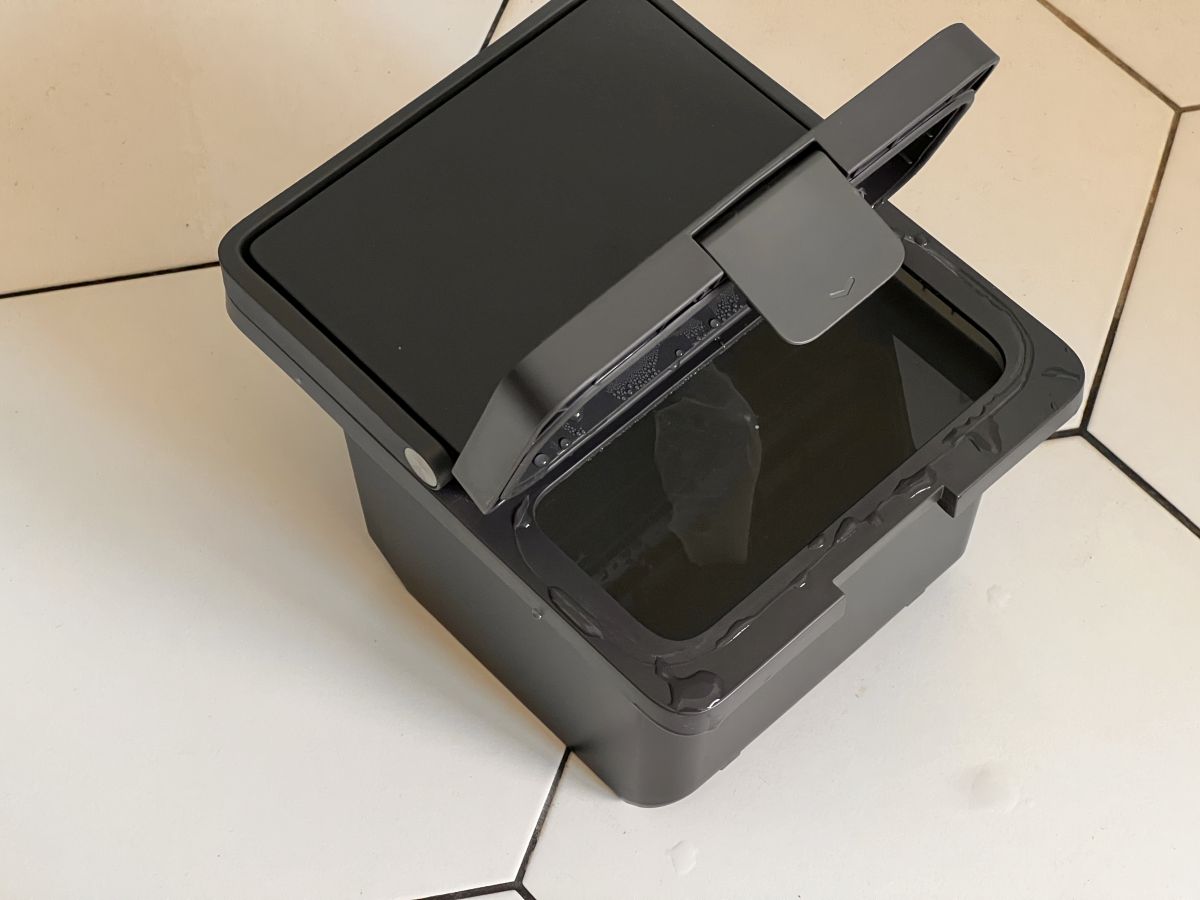 Zanim zaczniemy czyścić podłogi, należy jeszcze uzupełnić płyny. W stacji dokującej są 2 duże zbiorniki na czystą i brudną wodę, chronione zamykaną na zatrzask pokrywą. Ryzyko, że przy uzupełnianiu bądź wylewaniu wody coś nam się wyleje jest więc bardzo małe. Płyn do mycia podłóg uzupełniamy w mniejszym pojemniku dostępnym po zdjęciu frontowego panelu stacji dokującej. Producent zaleca wykorzystywanie firmowego koncentratu do mycia podłóg, jednak jego cena wydaj się dosyć zaporowa – ponad 100 zł półlitrową butelkę. Ja napełniłem zbiornik kupionym w supermarkecie koncentratem do mycia podłóg drewnianych, który kosztuje 10x mniej.