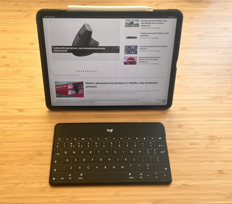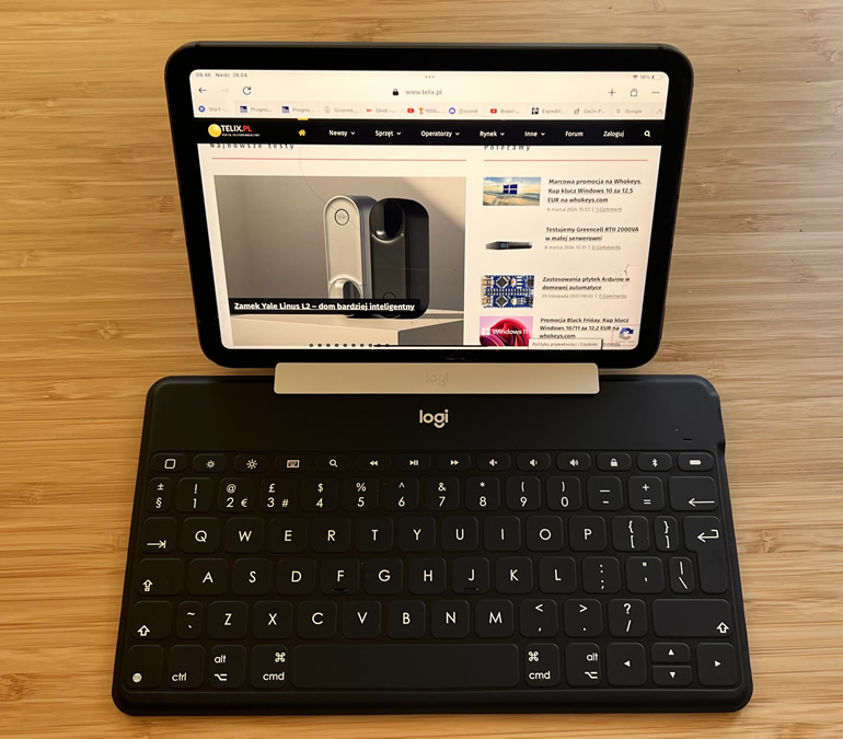 Keys-To-Go jest znacznie mniejszą klawiaturą w tym zestawieniu i można ją sparować z telefonami oraz mniejszymi i średnim tabletami. Specjalna podstawka nasuwana na klawiaturę pozwala na postawienie tabletu lub telefonu na stoliku i pisanie jak na niewielkim laptopie z rozłożonym ekranem. W przypadku większych urządzeń takich jak iPad Pro, ich waga jest zbyt duża i całość się przewraca. Do podstawki mieszczą się urządzenia o grubości ok 1 cm, więc jeśli mamy grubszy tablet lub korzystamy z obudowy ochronnej to może być konieczne jej zdjęcie.