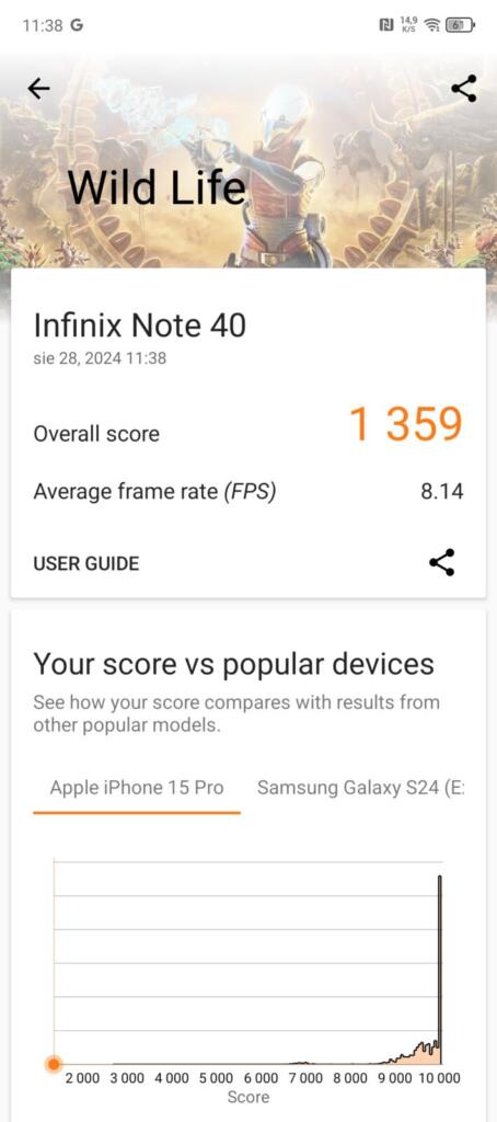 Pracą telefonu steruje jeden z lepszych procesorów firmy Mediatek – Helio G99 Ultimate, który dysponuje dwoma rdzeniami Cortex A76 2.2 GHz i 6 rdzeniami A55, 2 GHz. Układ graficzny to Mali G57 MC2. Daje to całkiem dobry zastrzyk mocy do większości codziennych czynności. Także w trakcie grania w nieco bardziej zaawansowane graficznie gry telefon daje radę, choć momentami możemy liczyć się ze spadkami liczby klatek na sekundę. Wyniki testów Geekbench 6, 3D Mark WildLife poniżej.