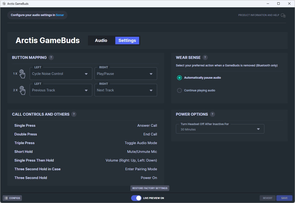 Arctis Gamebuds zostały wyposażone w przetworniki, które zapewniają czysty i dynamiczny dźwięk. Pasmo przenoszenia wynosi 20 – 20 000 Hz, co jest standardem w tej klasie urządzeń. Obsługiwany codec to Low Complexity Subband Codec (SBC), który jest standardem w większości tanich słuchawek. Szkoda, że nie zdecydowano się na zastosowanie kodeków aptX albo LDAC, które dają większą rozdzielczość dźwięku.