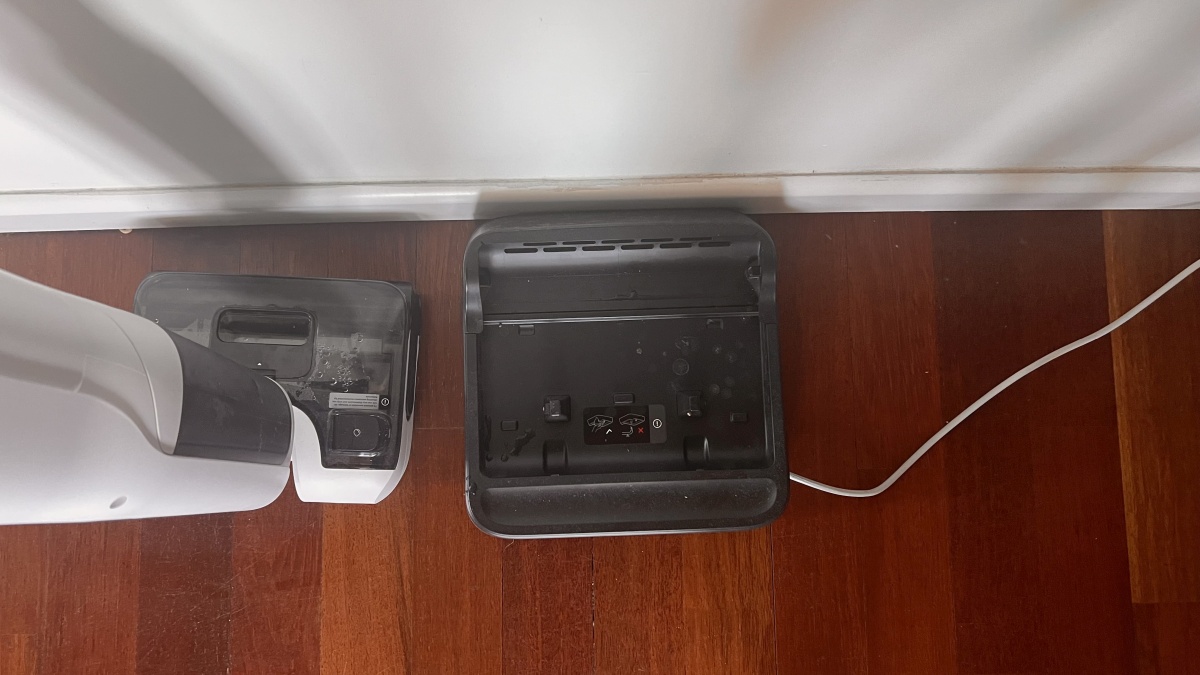 Stacja dokująca w której przebiega ten proces jest spora i przed zakupem warto zastanowić się,  gdzie ją umieścimy. Należy zapewnić jeszcze wolną przestrzeń nad stacją – tam gdzie postawimy odkurzacz do ładowania. Najlepsza byłaby do tego jakaś komórka na sprzęt do mycia, ale nie zawsze takim pomieszczeniem dysponujemy.