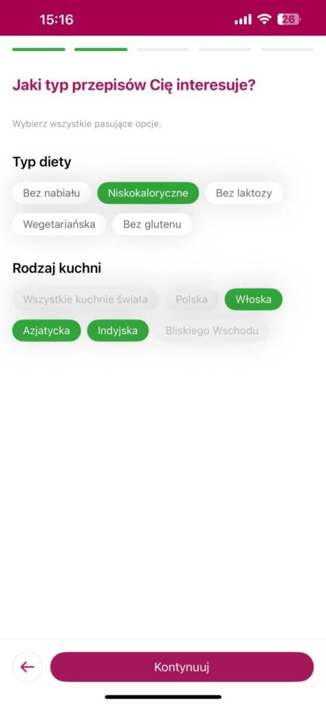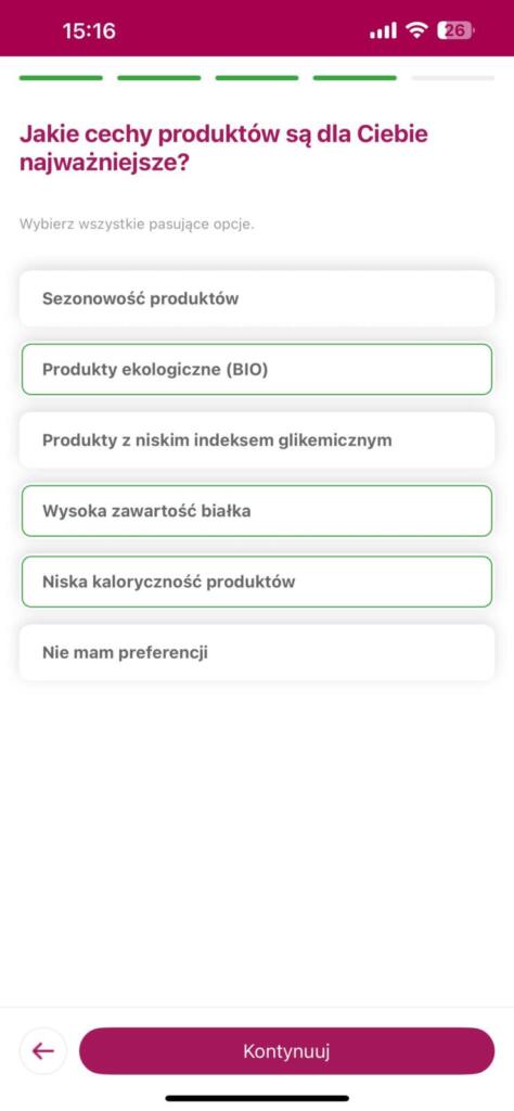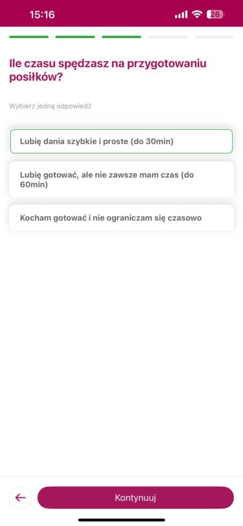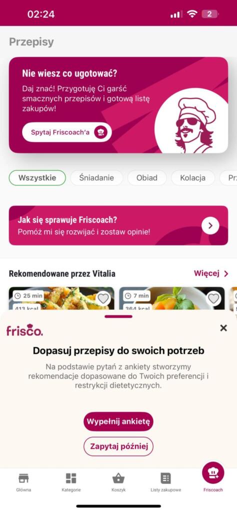 Sercem rozwiązania jest Friscoach — moduł, w którym uzupełnimy preferencje kulinarne i dietetyczne (np. wegetariańskie, bez laktozy, niskocukrowe). Całość rozpoczyna się od kilku-ekranowej ankiety, w której wybieramy ulubione rodzaju potraw, rodzaje składników oraz określamy liczbę posiłków i porcji.