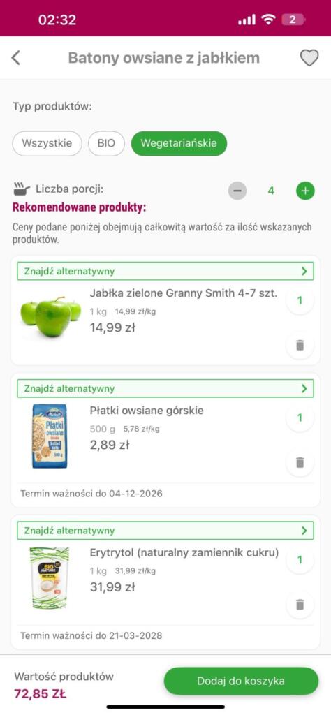 - Automatyczne dodawanie składników do koszyka z dopasowaniem gramatur, marek i opakowań do liczby porcji.