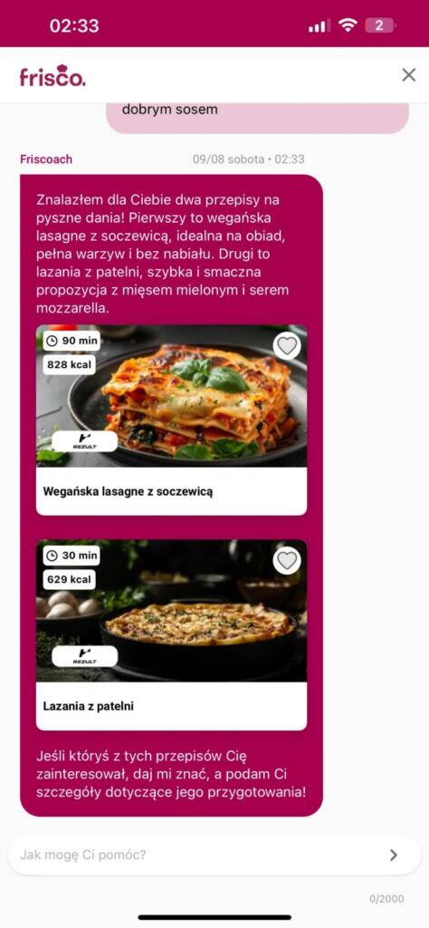 - Podpowiada przepisy z bazy Frisco albo na podstawie produktów, które już mamy w domu (np. „Mam cukinię i fetę — co ugotować?”).