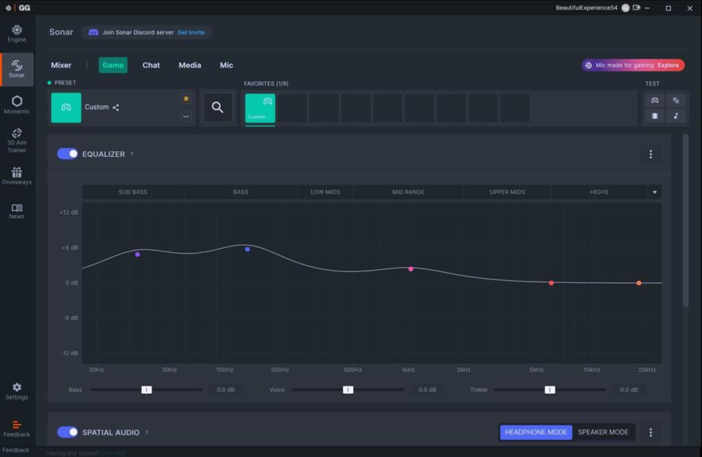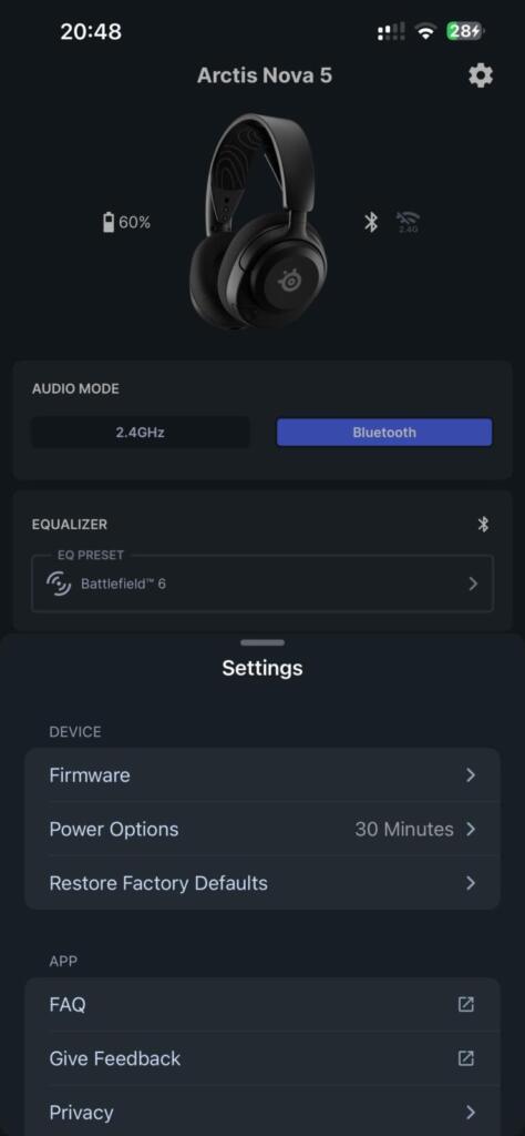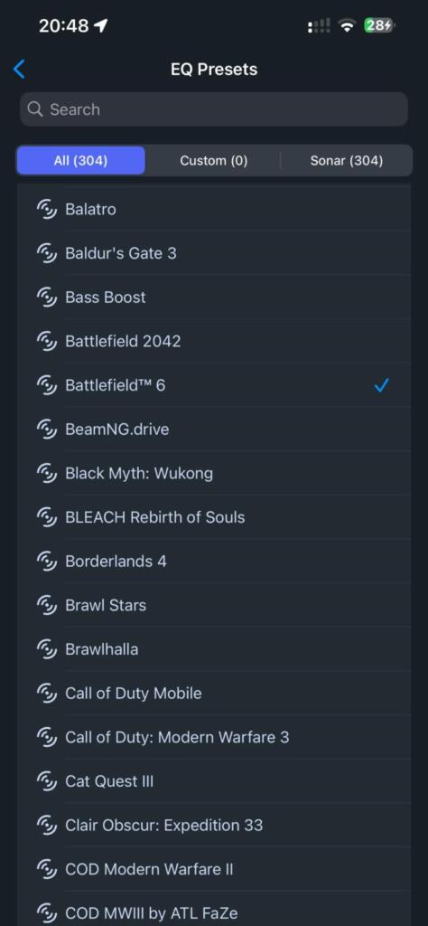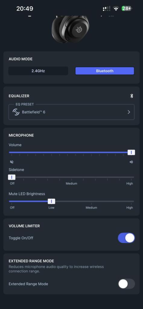 Oprogramowanie Arctis dostępne na telefony iOS oraz Android, pozwala na personalizację dźwięku, oferując kilkaset profili dźwiękowych dostosowanych do różnych gier, które możemy przeglądać alfabetycznie, wyszukiwać i dodawać do ulubionych. Aplikacja mobilna pozwala nam też na ustawienie trybu komunikacji: Bluetooth lub 2.4 GHz oraz regulację Passthrough mikrofonu (Sidetone).