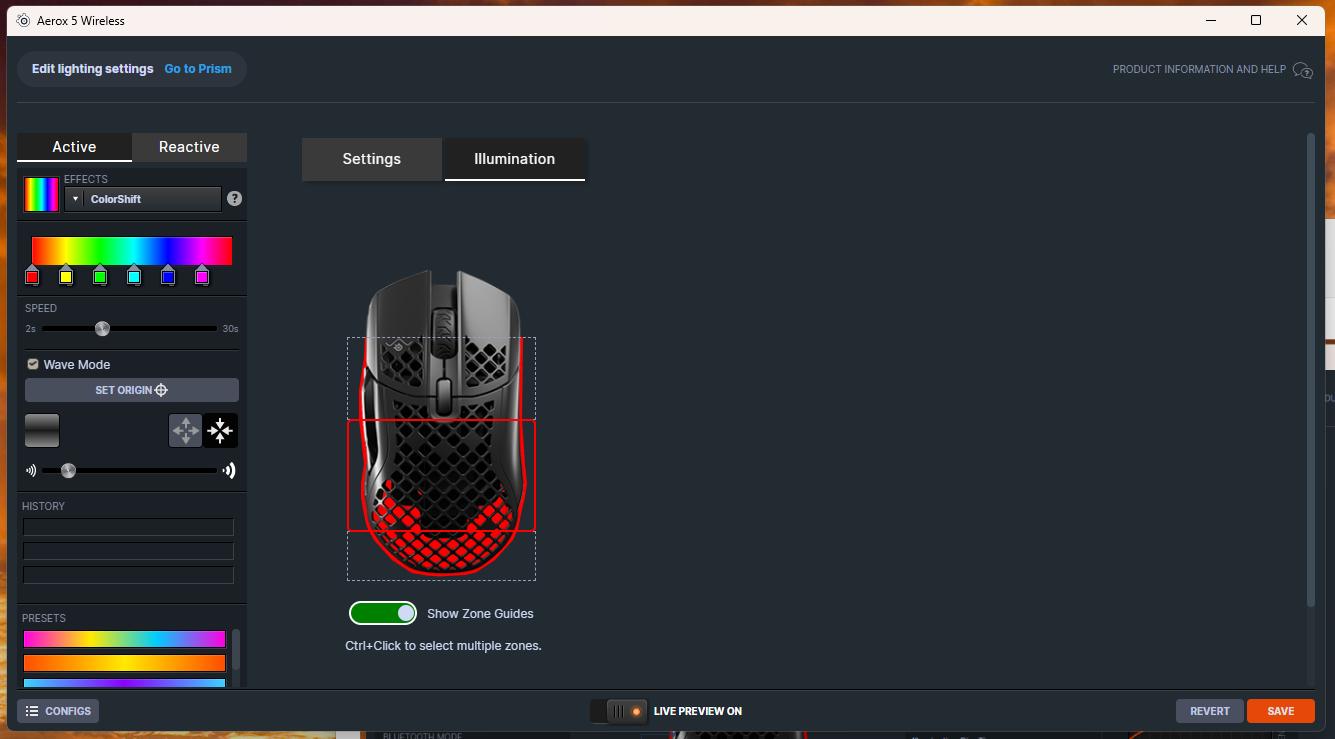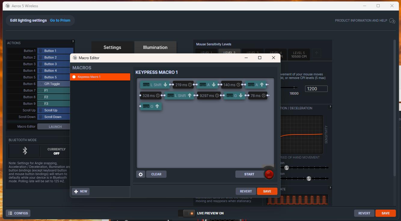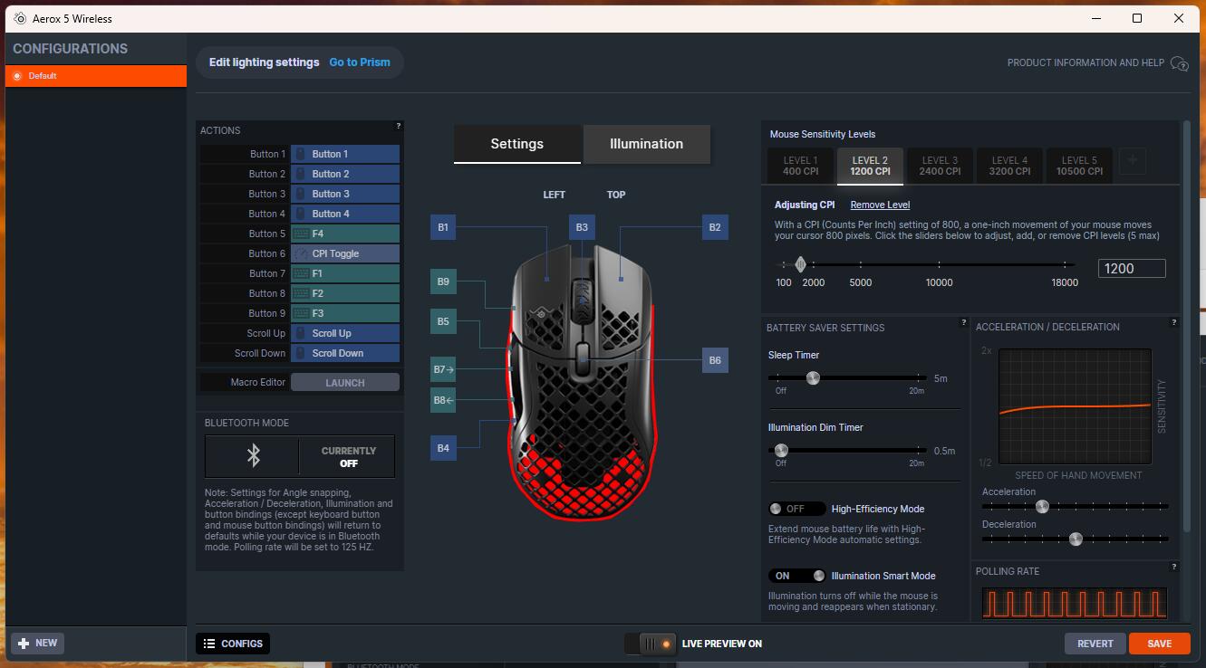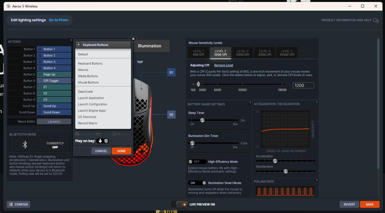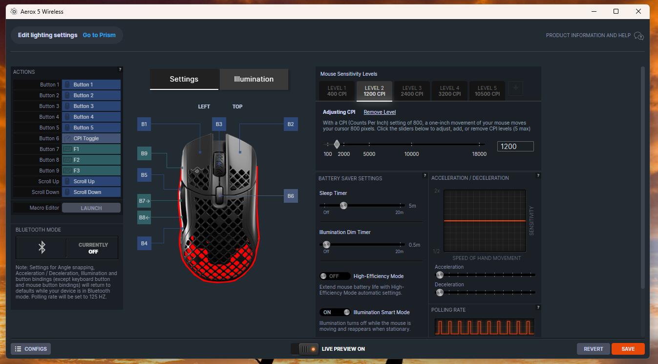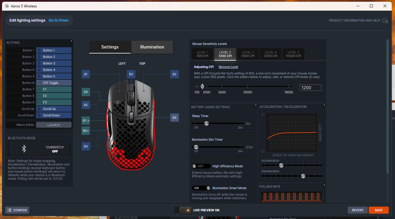 Zarządzanie ustawieniami odbywa się w aplikacji SteelSeries GG, która pozwala regulować czułość, mapowanie przycisków, makra i efekty RGB. Oprogramowanie jest stabilne i czytelne, choć momentami rozbudowane – nowi użytkownicy mogą poczuć przytłoczenie liczbą zakładek. Jeśli mamy więcej produktów SteelSeries to aplikacja pozwala na zarządzanie każdym z nich z jednego miejsca.