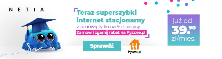 Dodatkowo, nowym klientom Netia proponuje smaczny dodatek dzięki wspólnej akcji z partnerem Pyszne.pl. Każdy klient, który podpiszę umowę w tej ofercie otrzyma kod rabatowy na zamówienie jedzenia przez portal Pyszne.pl