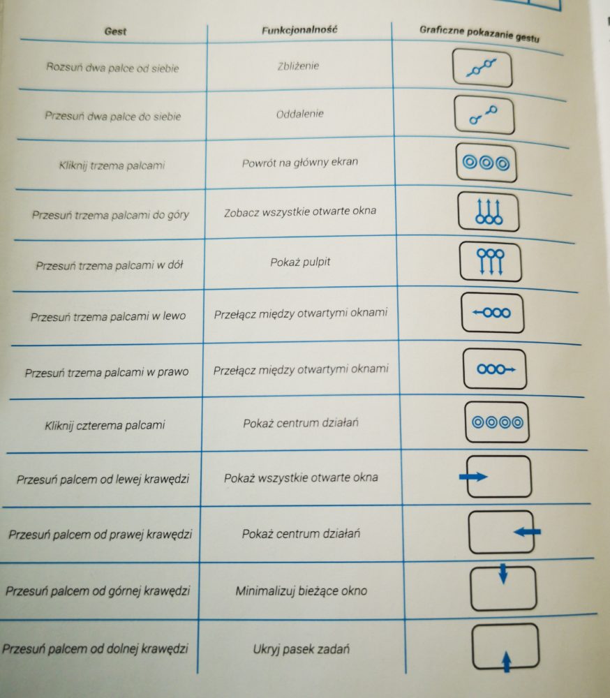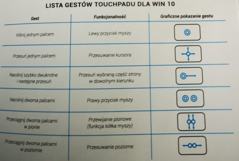 Pełna lista gestów, które mogą być obsłużone przez touchpad (w zależności od systemu operacyjnego):