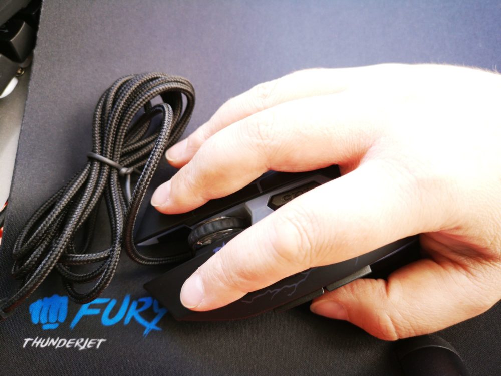 Mysz została wyprofilowana z dedykacją dla osób praworęcznych, wiec jak jesteś osobą leworęczną, to niestety musisz poszukać innej alternatywy. Jej wymiary to130×72×42mm. Waga 95g [bez kabla]. Pomimo swojego rozmiaru mysz jest bardzo wygodna i leży idealnie w dłoni. Wszystkie przyciski ułożone są w odpowiednim miejscu, co jest dodatkowym atutem. Wszystkie krawędzie myszki są bardzo dobrze wygładzone i wykończone. Nigdzie nie odczuwamy dyskomfortu czy niepotrzebnego ucisku. Oczywiście nie jest tak idealnie. Gumowy skroll niestety nie jest najlepiej umocowany – wręcz czuć jak przesuwa się na boki. Również samo kręcenie kółeczka nie jest zbyt płynne – czuć przeskoki. Również przyciski na prawym boku są do dopracowania – są bardzo deliktane i mają słabo wyczuwalne kliknięcie. Pomijając wspomniane mankamenty i tak moim zdaniem myszka jest bardzo wygodna. Pomimo kilkugodzinnej pracy czy gry nie czułam zmęczenia w dłoni. Bardzo komfortowo pracuje się na myszce przy ułożeniu palców 1+2+2.