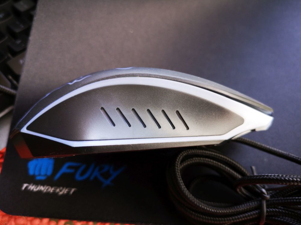 Mysz. Cała konstrukcja myszki wykonana jest z plastiku. Powierzchnia pod dłonią jest bardzo delikatna i miła w dotyku – ma się wrażenie jakby była pokryta powłoczką z gumy. Boki myszki wykonane są ze śliskiego plastiku z wydrążonymi przerwami. Taki zabieg pozwala na bardziej stabilne ułożenie palca na myszce. A co więcej nie zatrzymuje potu na myszce.