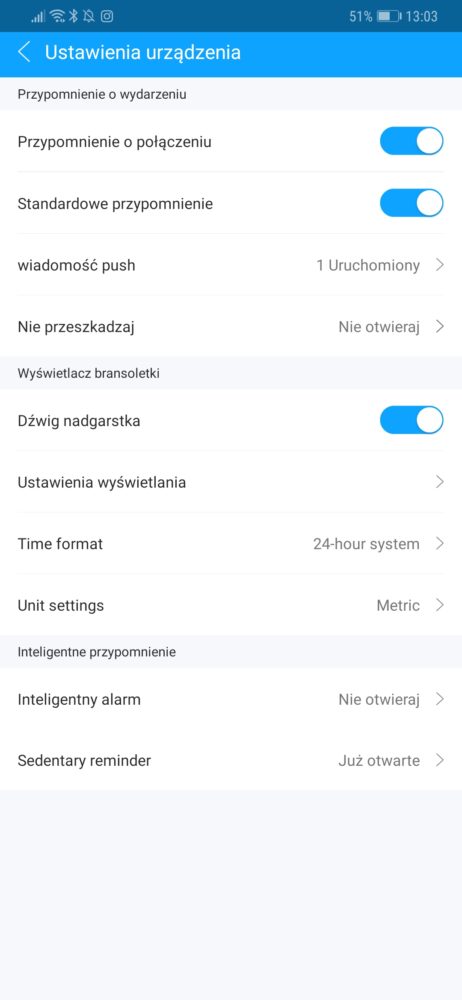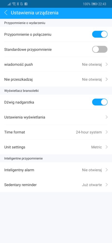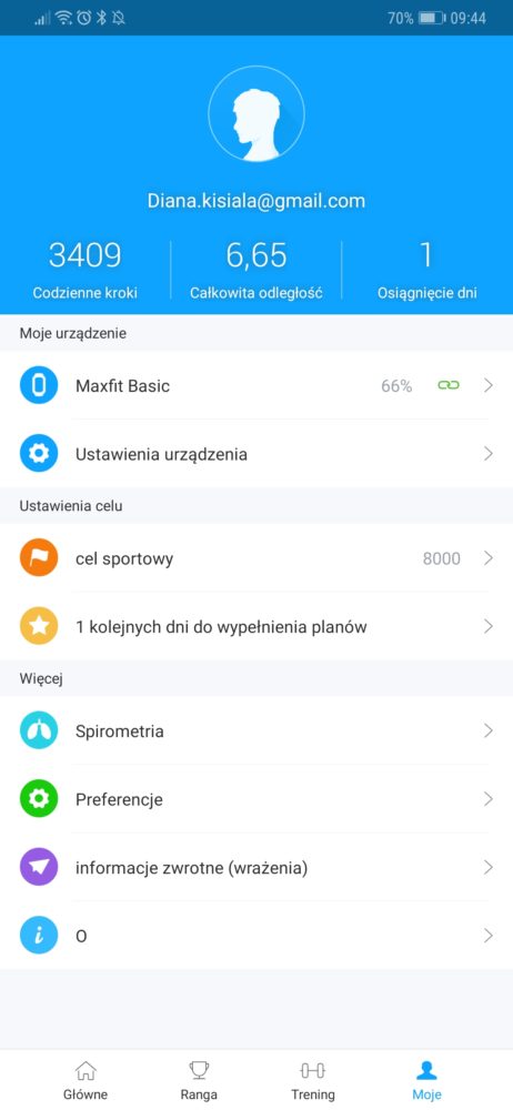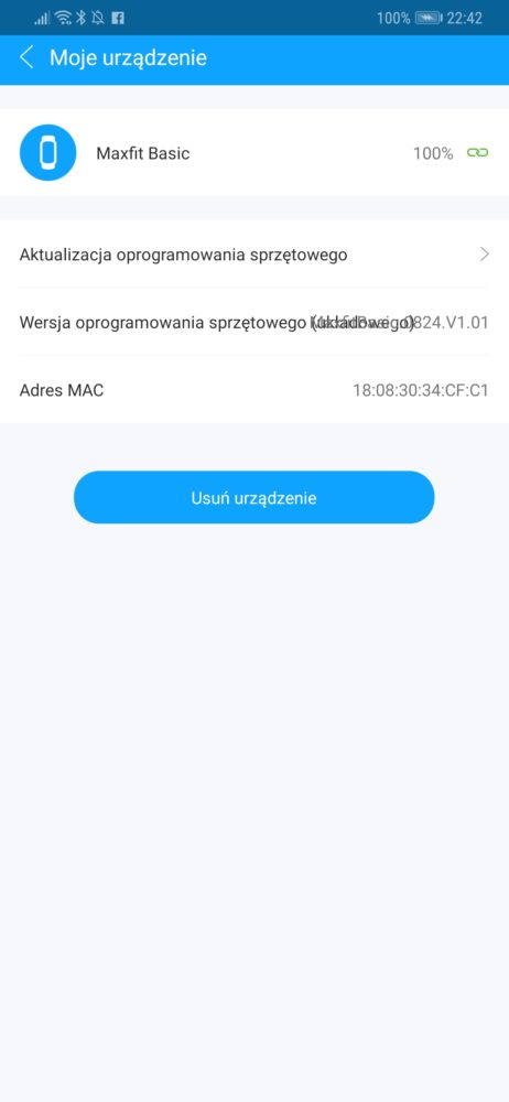 Po instalacji aplikacji (Ja używałam wersję na Androida) należy połączyć ją z opaską przez Bluetooth. Aby to wykonać należy w aplikacji w sekcji Moje urządzenia wybrać opcję Dodaj urządzenie i oczywiście włączyć w telefonie Bluetooth. W moim przypadku podłączenie nastąpiło bardzo szybo i bezproblemowo. Aplikacja pozwala na: