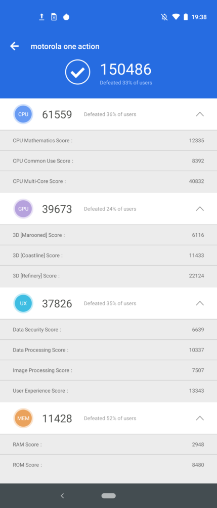 W Motorola One Action, podobnie jak Motorola One Vision, do dyspozycji otrzymujemy moc ośmiu, 64-bitowych rdzeni CPU Samsung Exynos 9609 2.2 GHz z układem graficznym Mali G72 MP3. Smartfon wyposażono dodatkowo w 4 GB pamięci operacyjnej, zaś na dane dostępne jest 128 GB pamięci wewnętrznej, którą można rozszerzyć za pomocą karty microSD o kolejne 512 GB. A gdyby jeszcze tego było nam mało, to dodatkowo, Google Photos oferuje bezpłatne, nielimitowane miejsce na zdjęcia wysokiej jakości oraz automatycznie dokonuje ich kopii zapasowej. Taka konfiguracja sprawia, że urządzenie zadowoli większość użytkowników urządzeń mobilnych. Smartfon płynnie odtwarza multimedia i w zupełności wystarcza do zabawy nawet w najbardziej wymagające aplikacje czy gry. Szkoda tylko, że podczas dłuższej zabawy SPU, troszkę się grzeje. Benchmark AnTuTu, którego używam do testów wyświetlił ponad 150 tys. punktów.