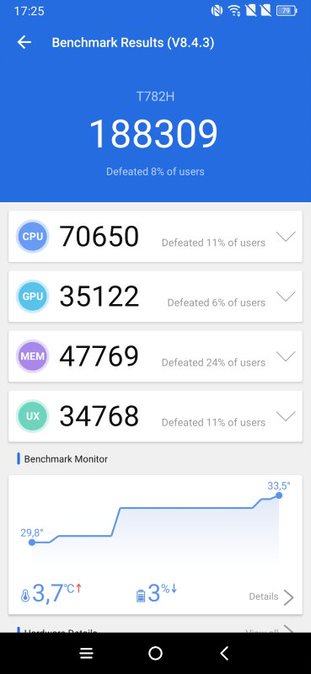 W benchmarku AnTuTu telefon uzyskał ponad 188 tys. punktów. Liczby wskazują na to, że system w prezentowanym modelu powinien działać dosyć płynnie w tej klasie cenowej. I w rzeczywistości tak jest. Smartfon działa wystarczająco płynnie. No może poza sporadycznymi przycinkami, gdy miałem odpalone zbyt dużo aplikacji, ale w tej klasie cenowej nie jest to niczym dziwnym. Nic się zawiesza, a ogólne wrażenia są jak najbardziej pozytywne. Specyfikacja TCL 10 Plus w pełni wystarczy do korzystania z wszystkich podstawowych funkcji smartfona – od Internetu, przez aplikacje, na multimediach kończąc.