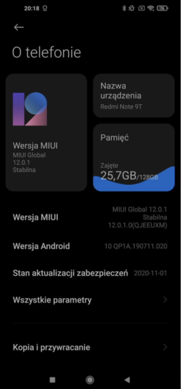 Redmi Note 9T 5G zarządzany jest przez system Android w wersji 10 oraz nakładkę MIUI 12 (w przypadku testowanego modeli aktualizacja bezpieczeństwa jest na dzień 1.11.2020r.). W przypadku testowanego modelu system działa wystarczająco płynnie i dokładnie tak jak się spodziewamy w tej klasie sprzętu.