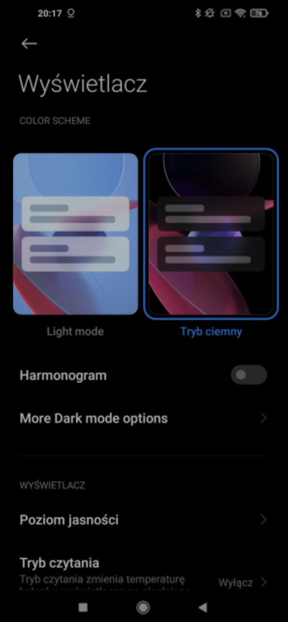 Jeżeli chodzi o sam wyświetlacz to jest on wyraźny i czytelny, ale mam wrażenie, że kolory są jakby lekko bladsze – brakuje im nasycenia, są takie przygaszone. Poza tym krawędzie czcionek są ostre i możemy w miarę komfortowo pracować z wszelkiego rodzaju aplikacjami, stronami WWW czy dokumentami. Dopasować możemy takie parametry jak: jasność, tryb kolorów (Domyślne, Ciepłe, Chłodne, Własny), rozmiar tekstu czy włączyć tryb ciemny oraz tryb czytania. Co więcej smartfon został certyfikowany przez TÜV Rheinland, co świadczy o niskiej emisji światła niebieskiego. Ekran traci niestety na czytelności w słońcu.