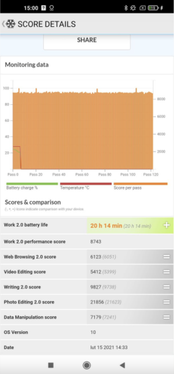 Ponad to na pokładzie testowanego modelu znajdziemy 4 GB pamięci RAM i 128 GB (UFS 2.2) pamięci ROM, którą możemy dodatkowo rozszerzyć o kartę pamięci – micro SD. Możliwy jest też wariant 64 GB (UFS 2.1) pamięci ROM. W benchmarku AnTuTu smartfon uzyskał ponad 293 tys. punktów (konkurencyjny model Realme 7 5G – 331 tys. punktów). To nie najgorszy wynik, który potwierdza się również w codziennym użytkowaniu. Smartfon działał dosyć płynnie i bez większych zadyszek, ale jednak mocne załadowanie go aplikacjami daje się odczuć. Podobnej klasy smartfon konkurencji – Realme 7 5G (z tym samym procesorem i obsługą sieci 5G) – otrzymał 6 GB pamięci RAM i takiego wariantu spodziewałam się również tutaj.